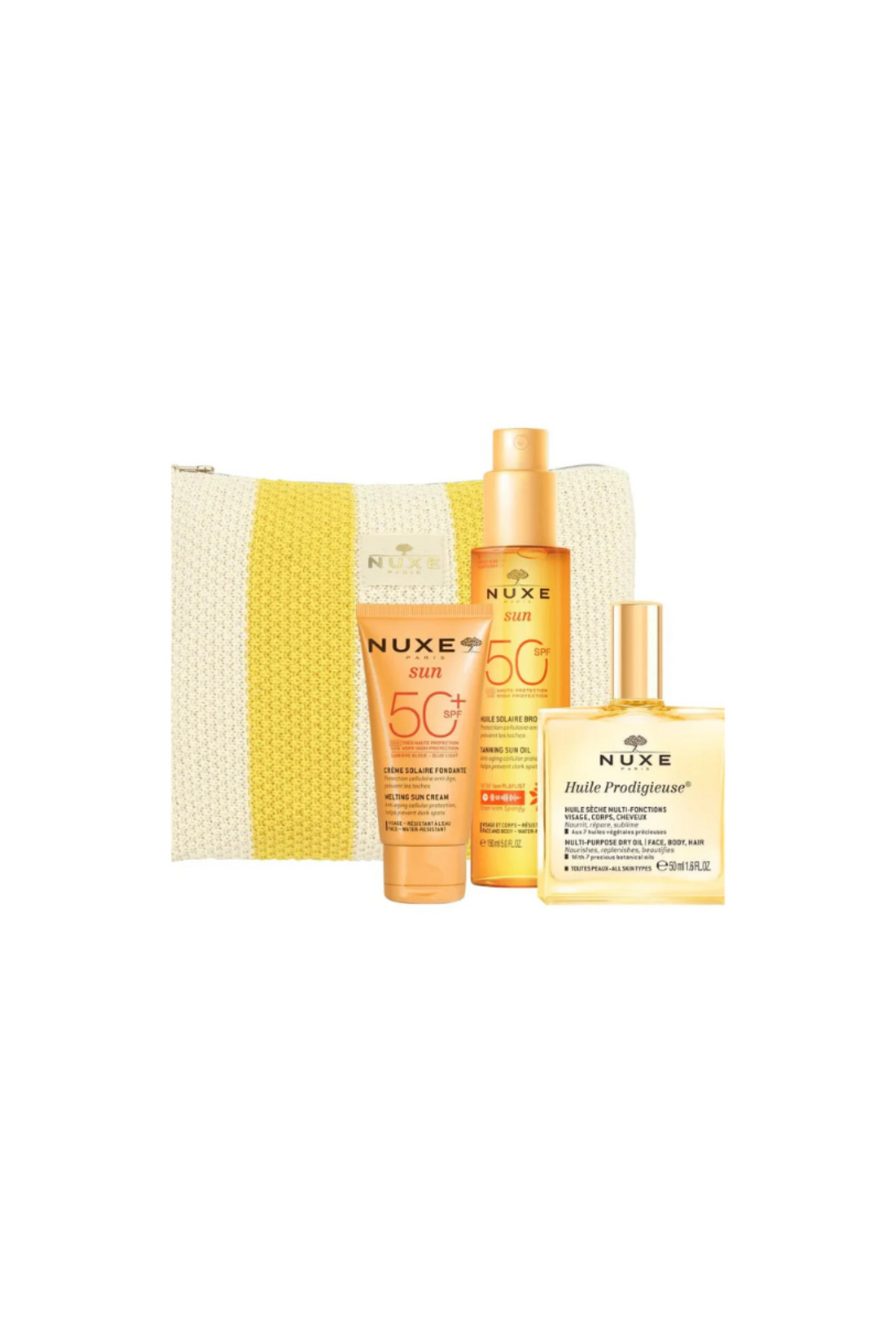 How to use Nuxe Sun Face Cream SPF50+: apply the product to your palms and massage gently onto your face, avoiding the eye area. Huile Prodigieuse: can be used all year round on the body, hair, and face. On the body: spray onto your palms or directly onto the skin and massage until absorbed. On hair: apply to lengths and ends. For thick hair, it can be used as a moisturizing mask before shampooing (leave on for 10 minutes). On the face: apply with gentle movements, from the center outwards. Can be used alone or mixed with moisturizer. Nuxe Sun Bronzing Sun Oil SPF50: apply the product to your palms and massage onto your face, avoiding the eye area. On the body, spray directly and massage gently. Apply generously before sun exposure.