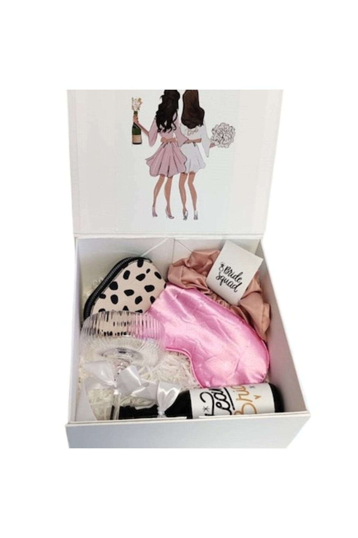 bottle of wine; glass; hair elastic; mini wallet; sleeping mask; box with magnetic closure
