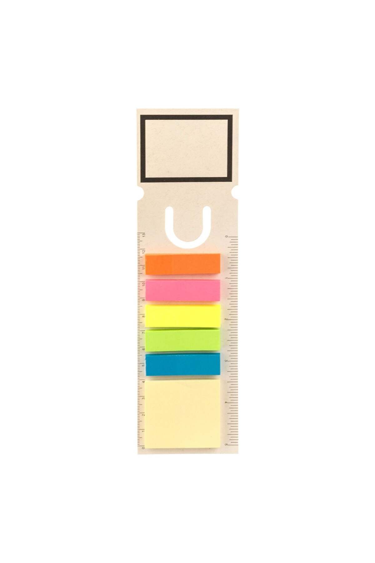 Etichete tip semn de carte cu rigla la ambele capete si notite de 5 culori (4.5x1cm), impreuna cu notite adezive galbene (4.5x4cm).