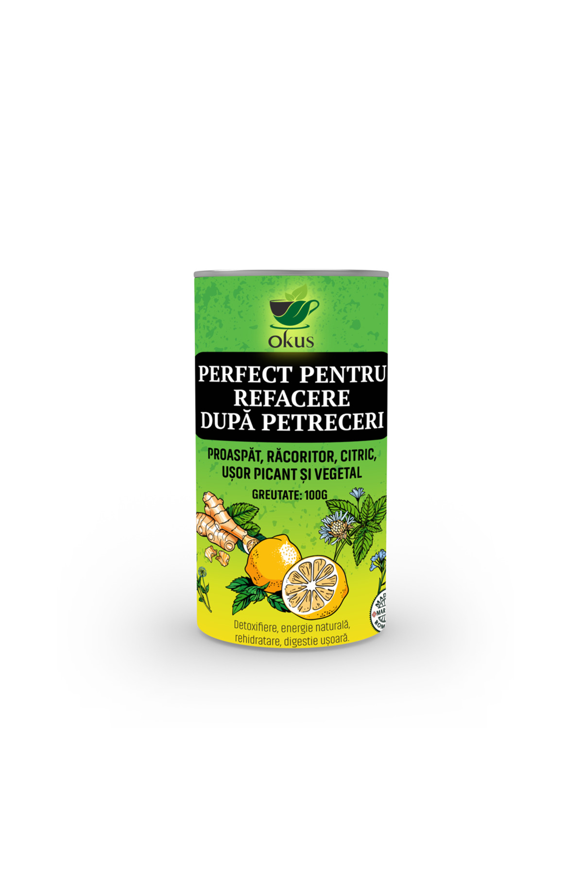 ceai verde Gunpowder, rădăcină de ghimbir uscată, mentă uscată, flori de păpădie uscate, coajă de lămâie uscată, frunze de urzică uscate