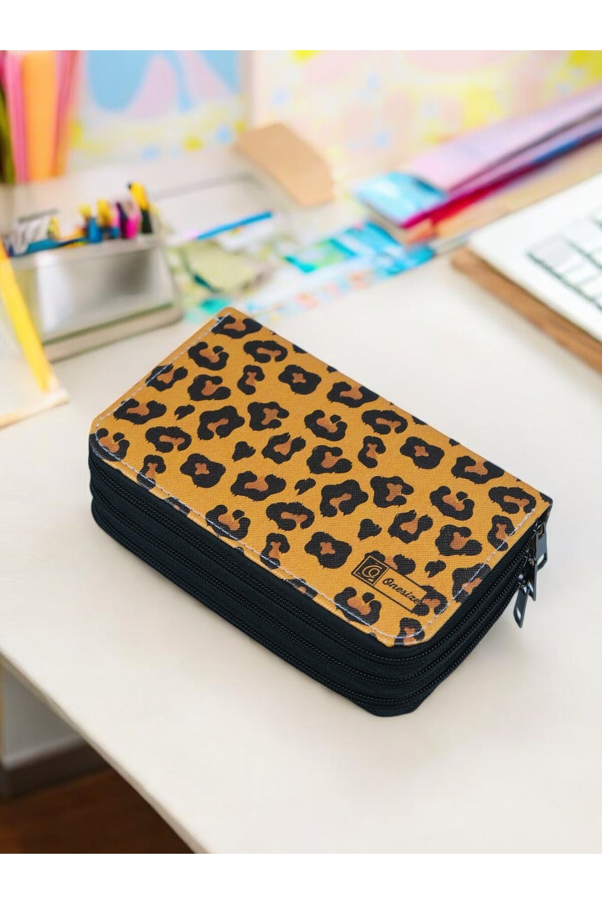OneSize Pencil Case Leopard Pattern Three Compartment Vegan Leather (Pencil Case) features