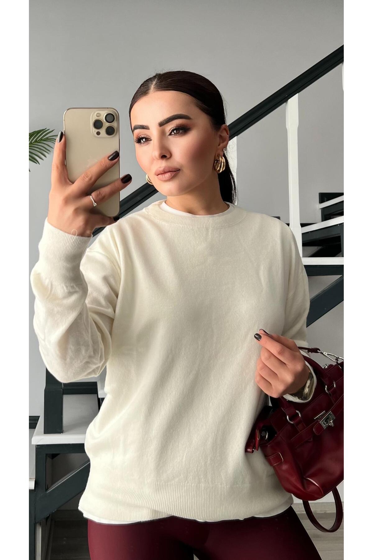 Oslove Ecru Crew Neck Wool Basic Sweater