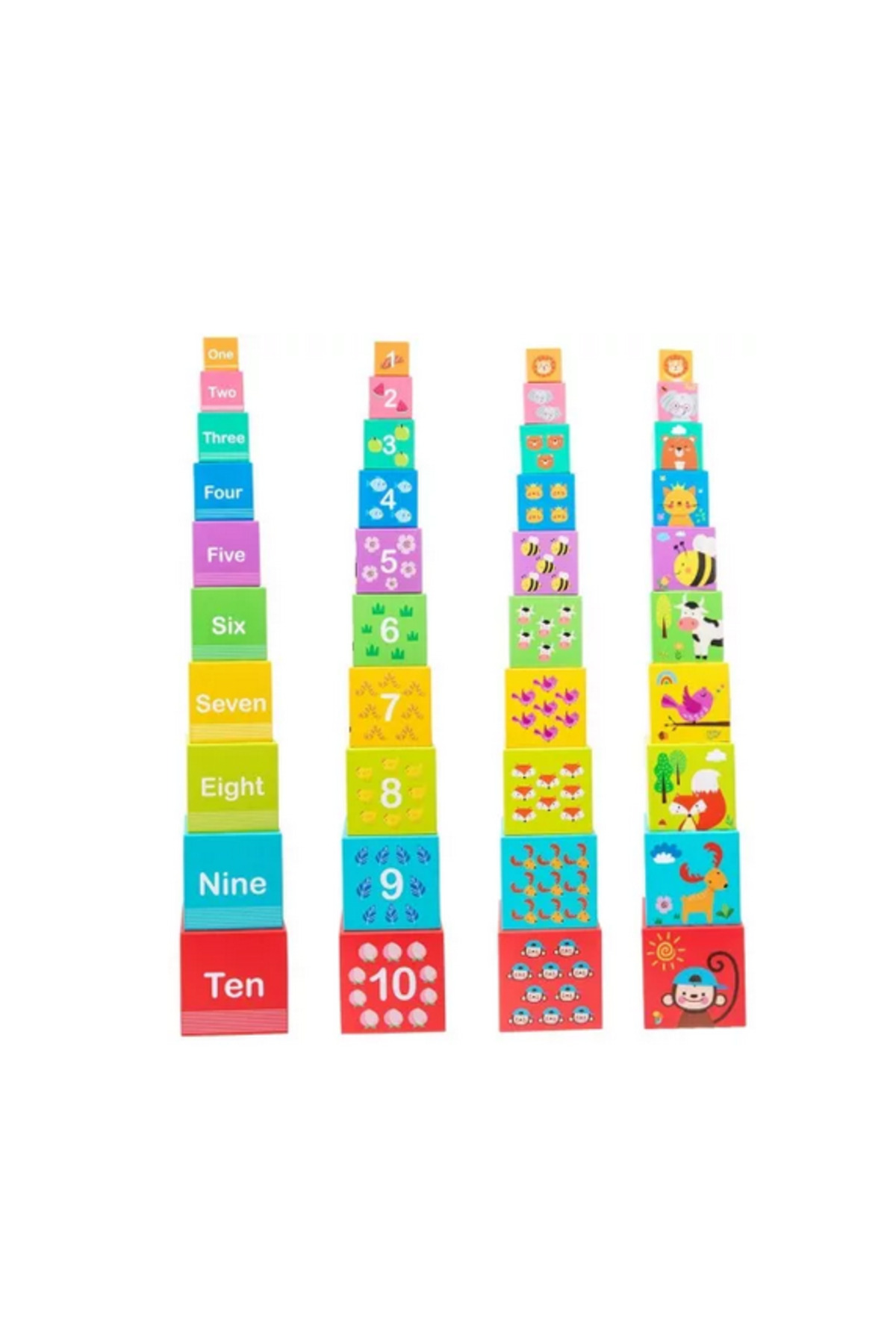 Early number learning: children discover digits and the concept of numeric order via stacking, Visual association: each box has images and matching numbers to help associate numbers with objects, English language exposure: illustrations include English words to stimulate language learning through play, Motor development: stacking activities improve hand-eye coordination and dexterity, Play-based learning: encourages logical thinking, patience and attention to detail