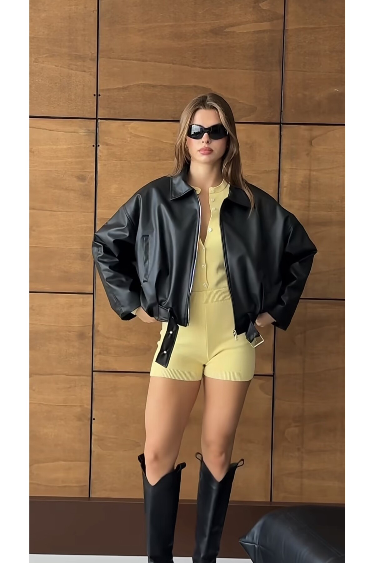 PRİFALDİ Oversize Bomber Leather Jacket features