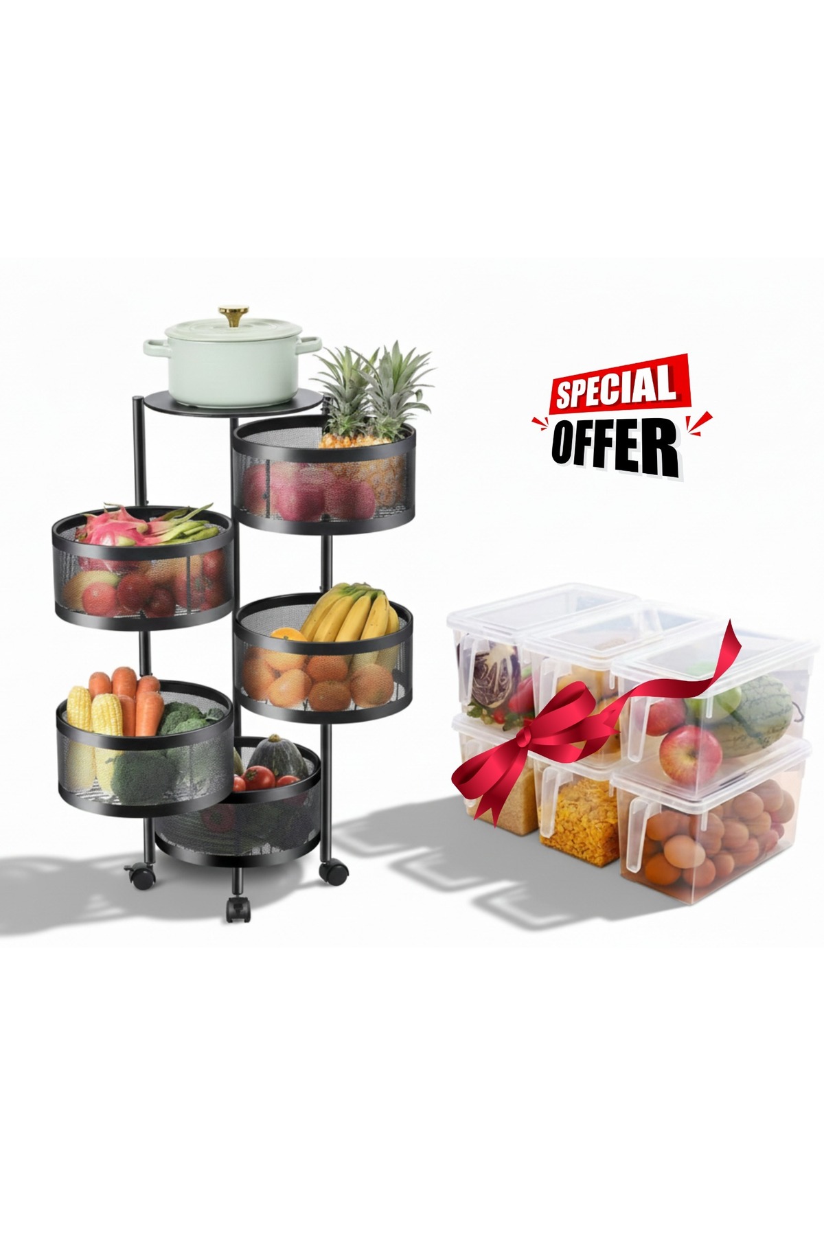 Primo Plus Complete Kitchen Organization Bundle – 360° Rotating Multi-Layer Rack & Refrigerator Storage Set
