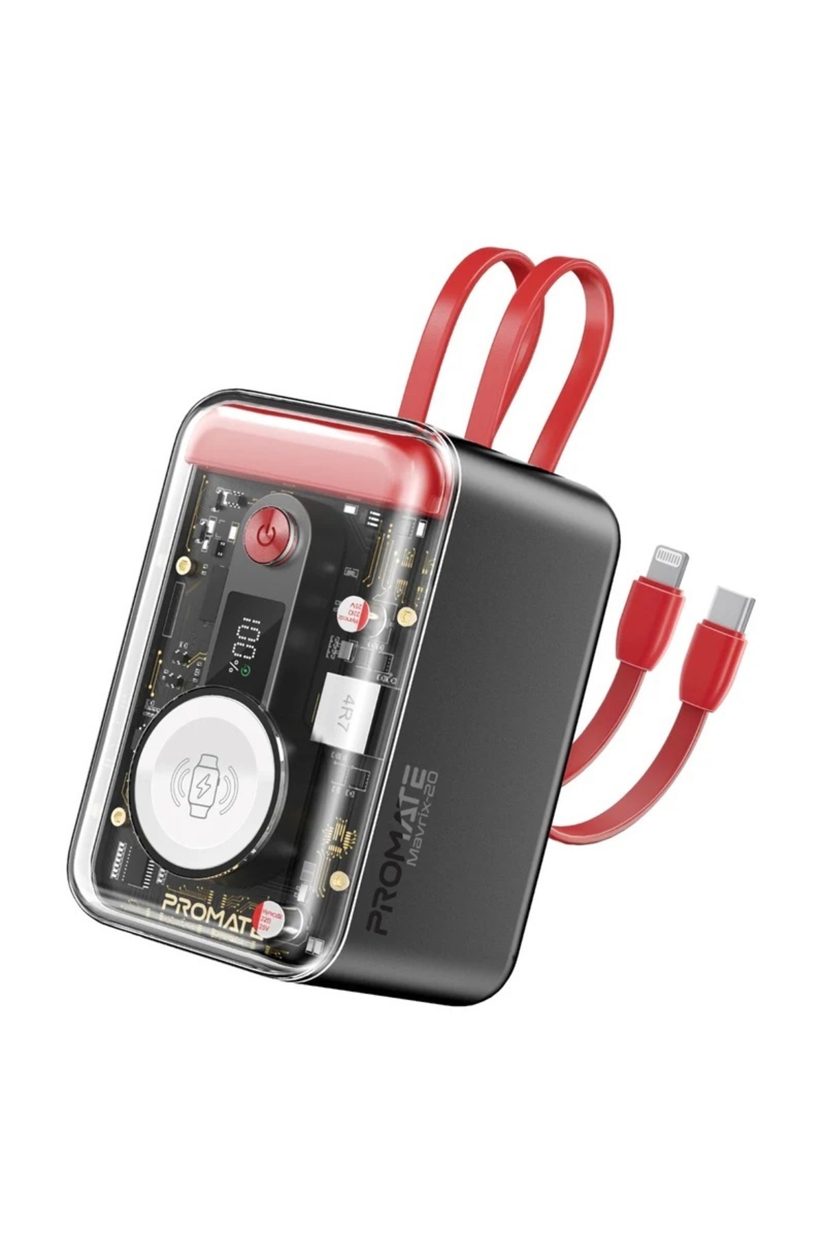 Promate 65W Multi-Device Charging Transparent Power Bank with Built-In USB-C & Lightning Cable features