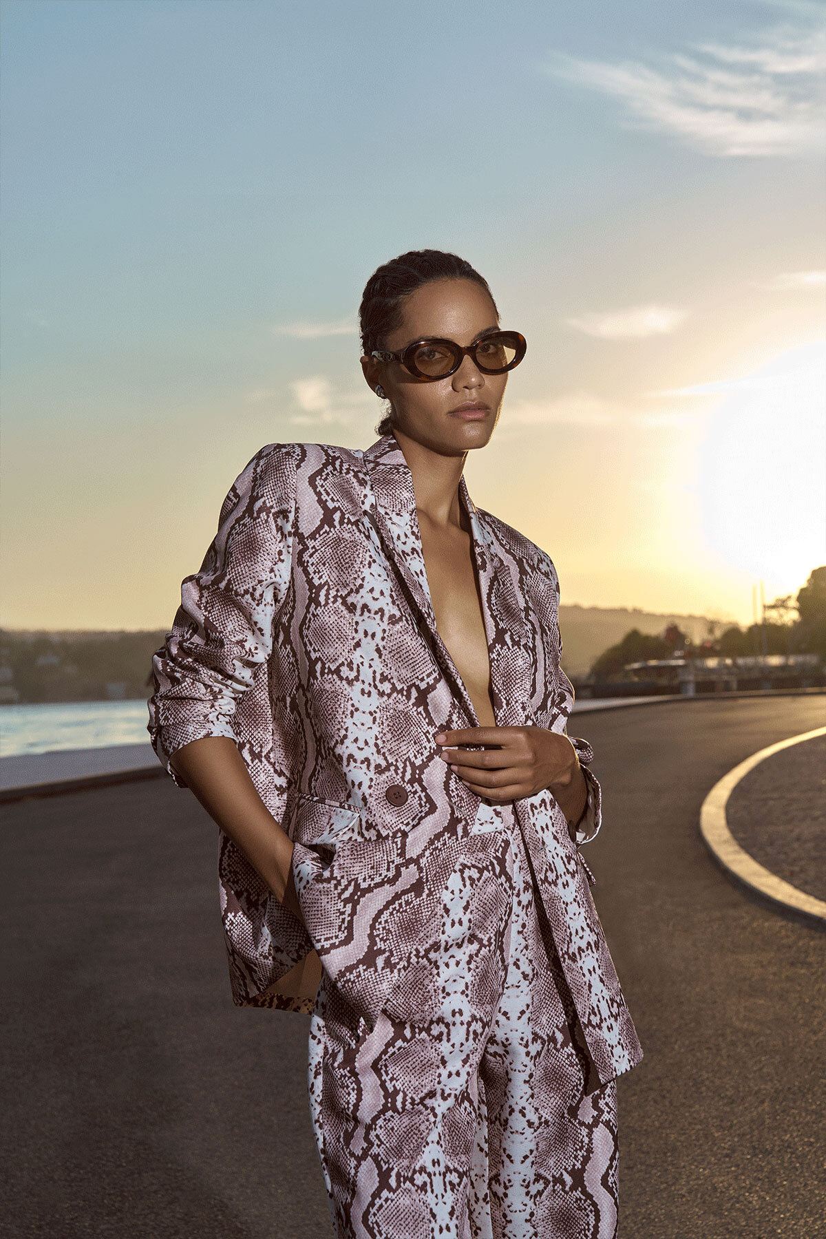 Quzu Brown Snake Patterned Double BreastedBlazerJacket features