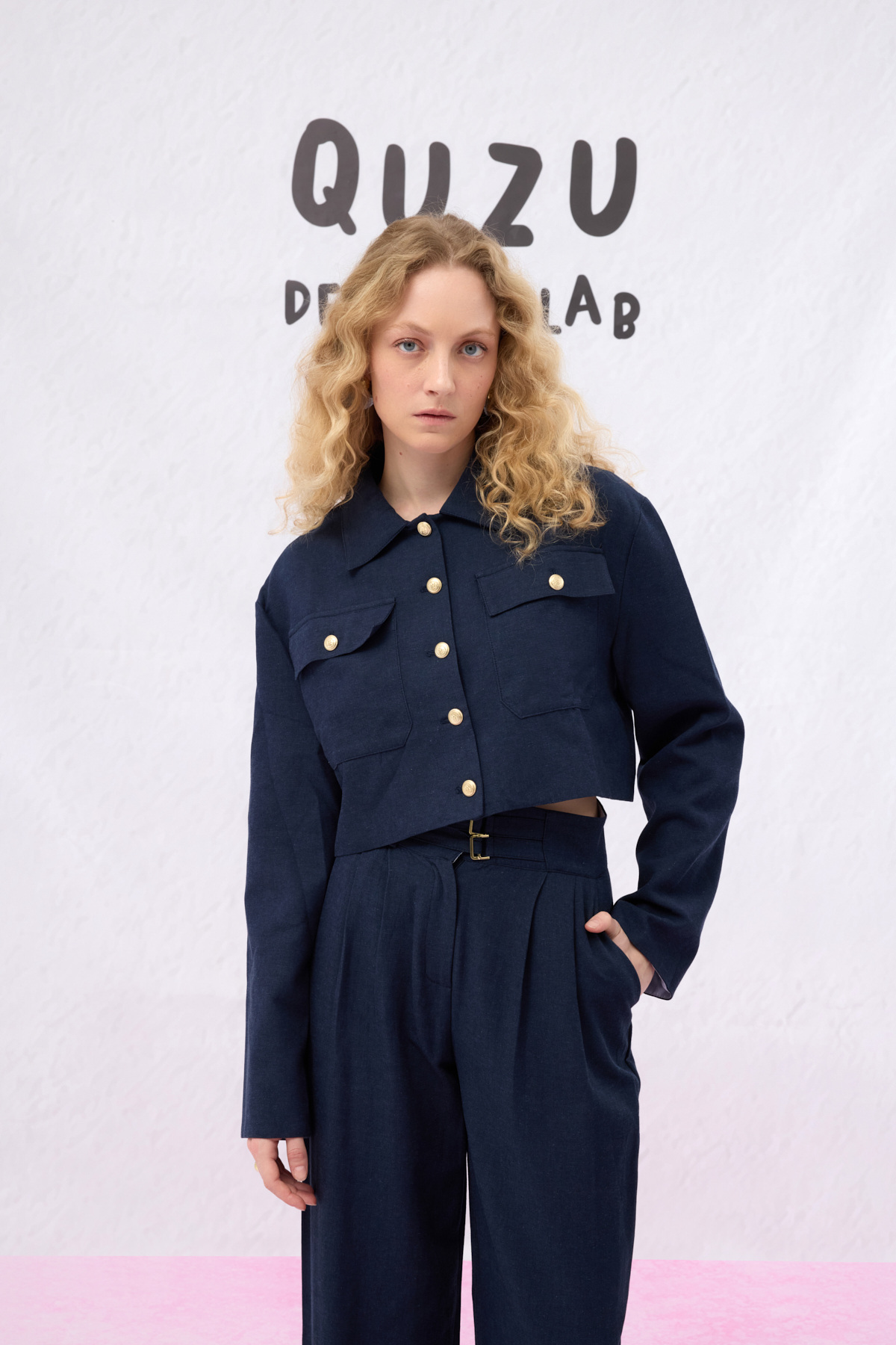 Quzu Buttoned Short Jacket with Large Pockets Navy Blue features