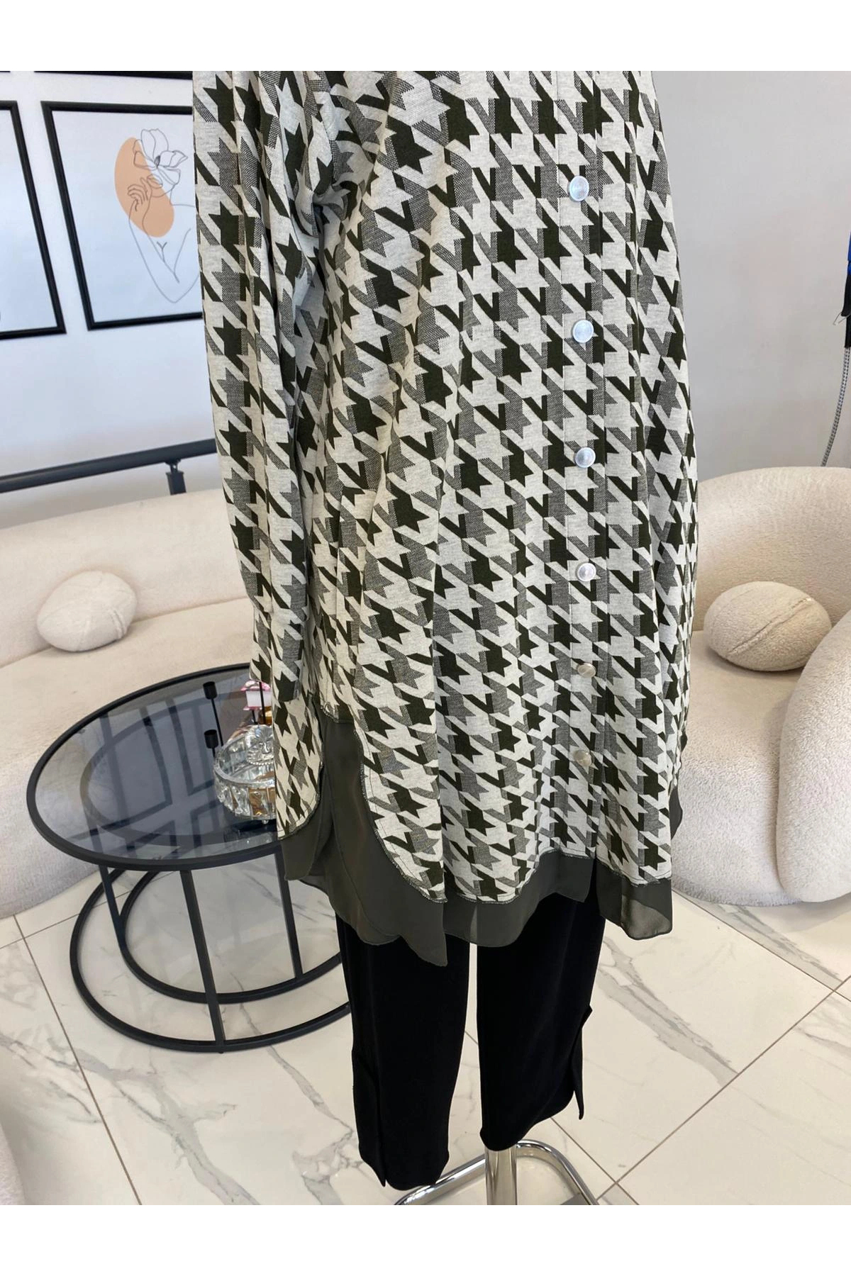 red show Houndstooth pattern jacket features
