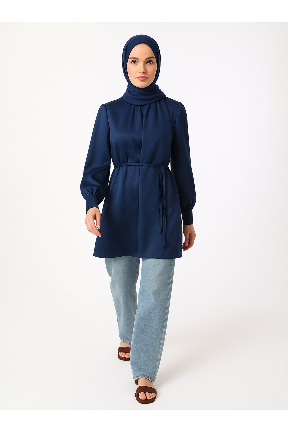 Refka Satin Tunic with Binding Detail - Navy Blue - Refka