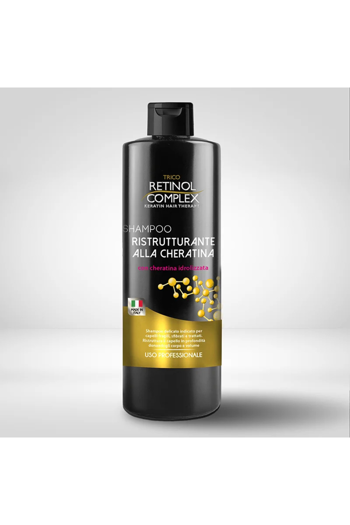 Wet hair thoroughly. Apply shampoo to scalp and lengths; massage 1–2 minutes to activate the keratin. Rinse thoroughly. Repeat if necessary. For complete repair, continue with the Retinol Complex Keratin Mask or Conditioner.