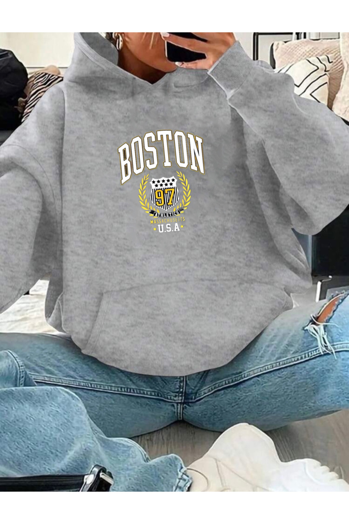 RPT MODA Oversized Boston Printed Basic Sweatshirt with Hooded