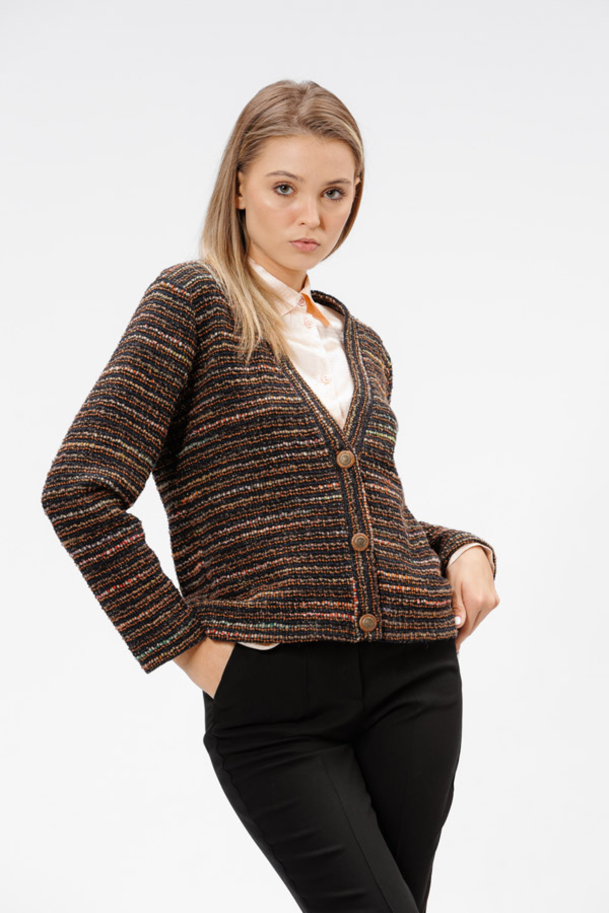 RVL Buttoned cardigan, brown with multi-colored inserts features