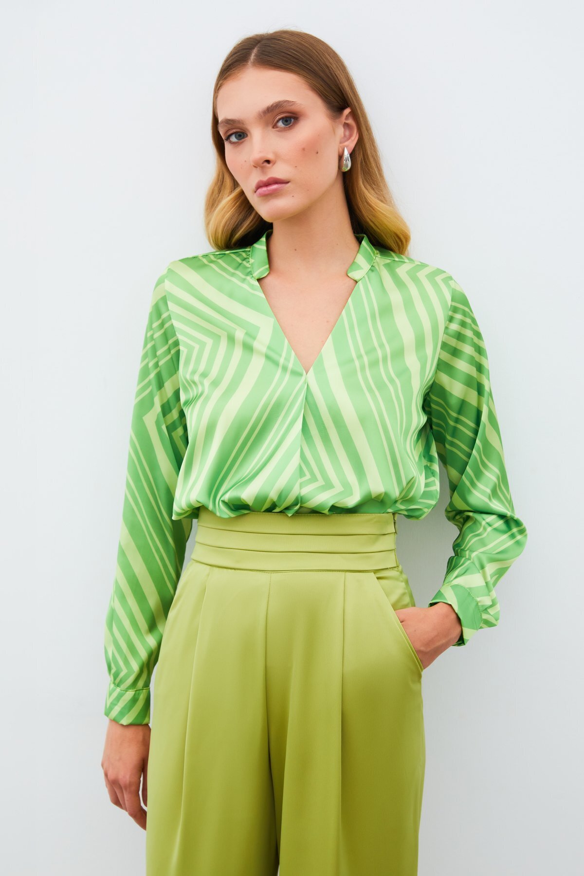 Sateen Double Breasted Patterned Blouse - Green features