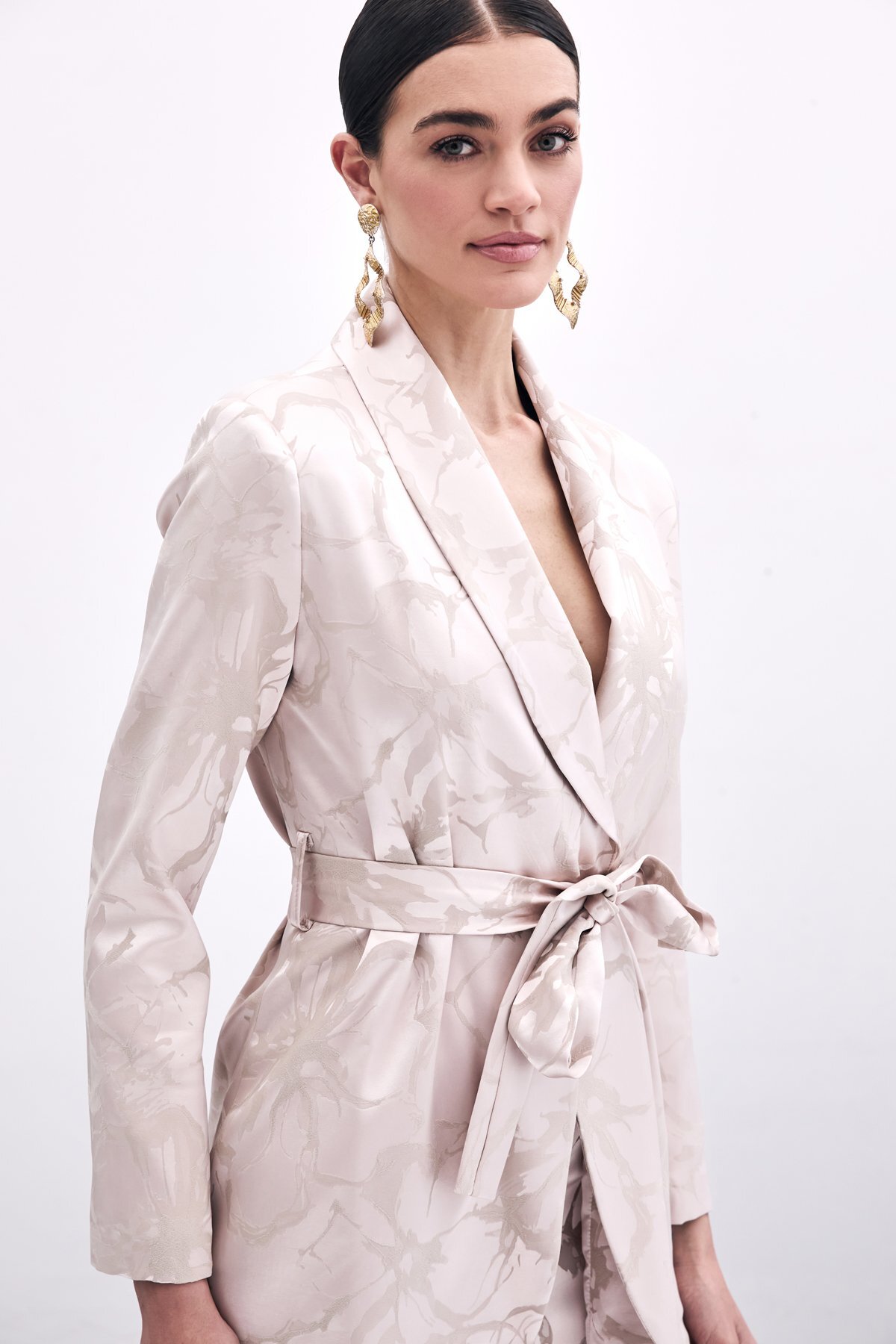 Sateen Patterned Long Jacket - Powder features