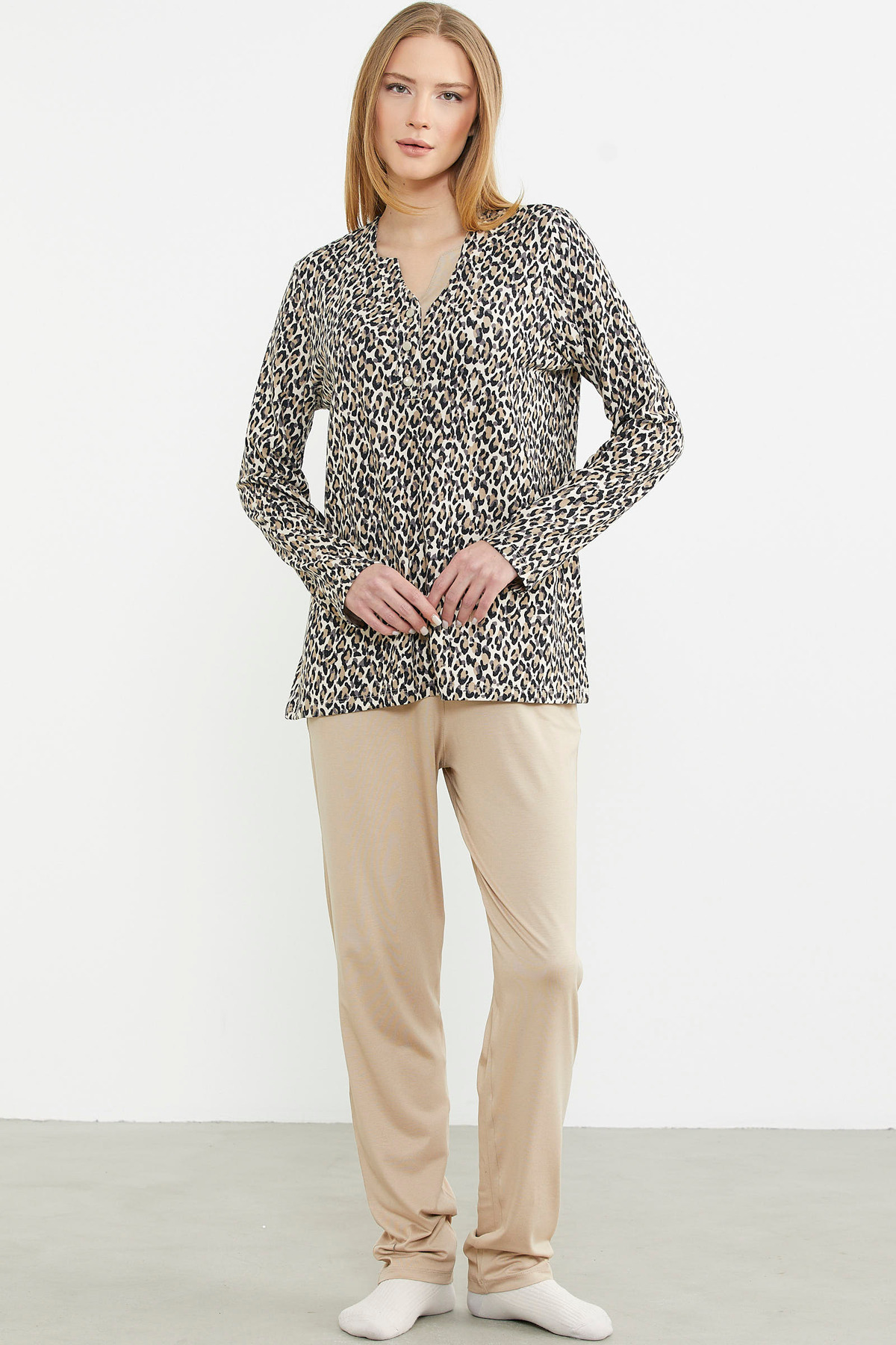 Sementa Leopard Print Beige Pajama Set - Buttoned Neck features