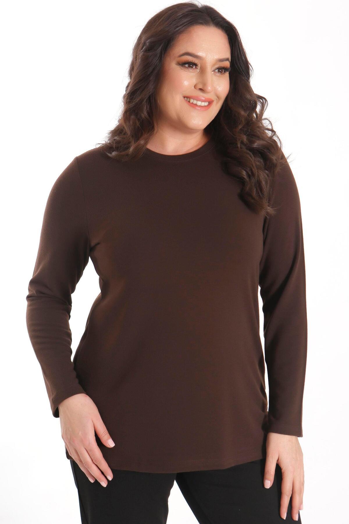 SERTUĞ Trend42Plus Plus Size Basic Crew Neck Brown Blouse