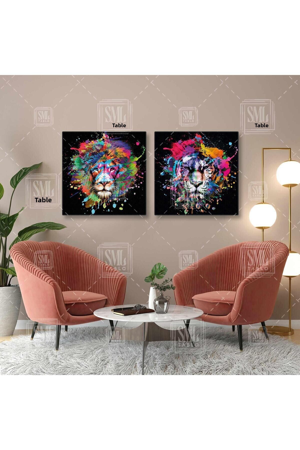 SML TABLO Lion and Tiger Double Square Combination of Paint Splashes Set of 2 Canvas Painting features
