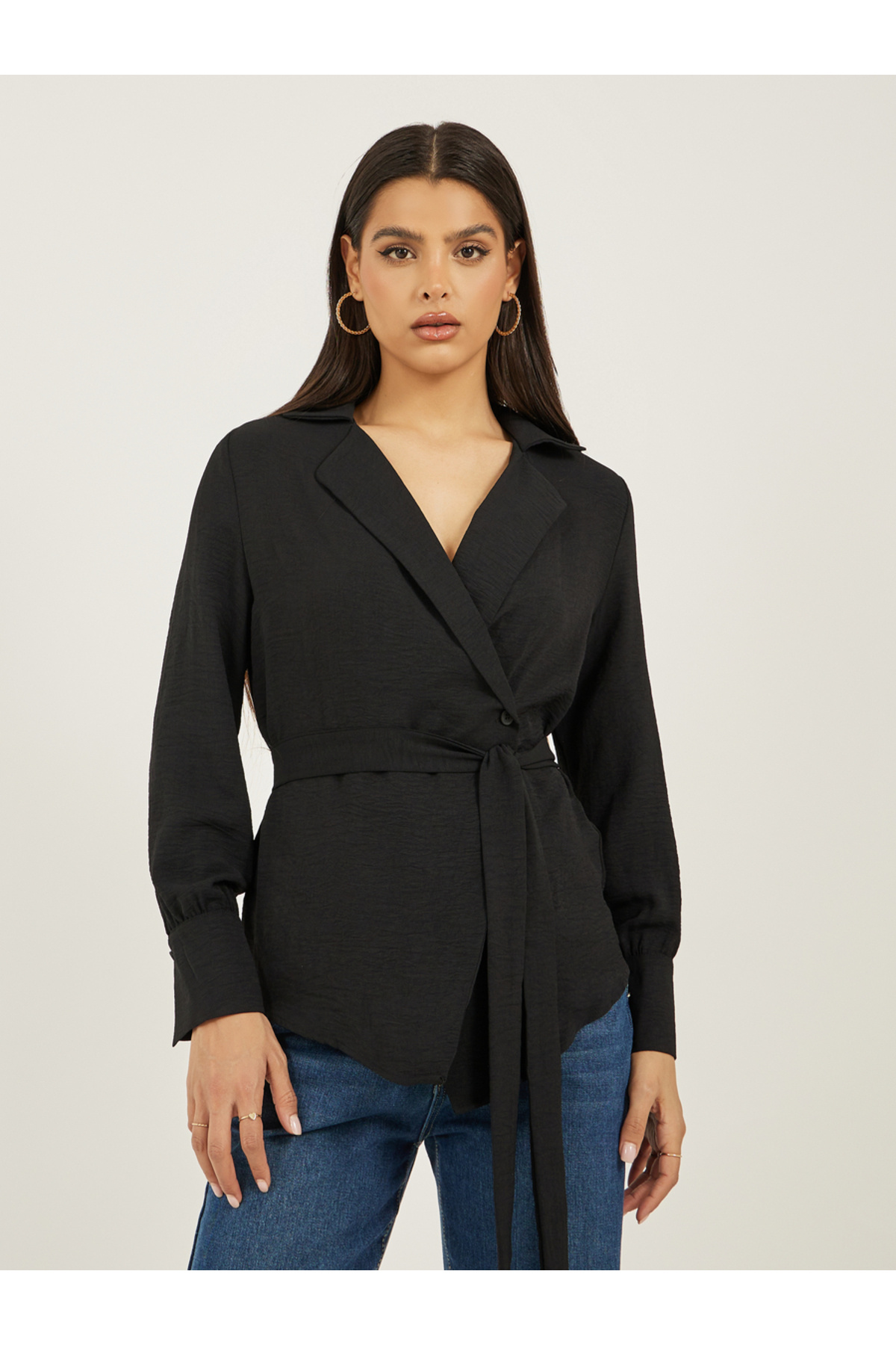 Styli Black Solid Wrap Belted Blouse features