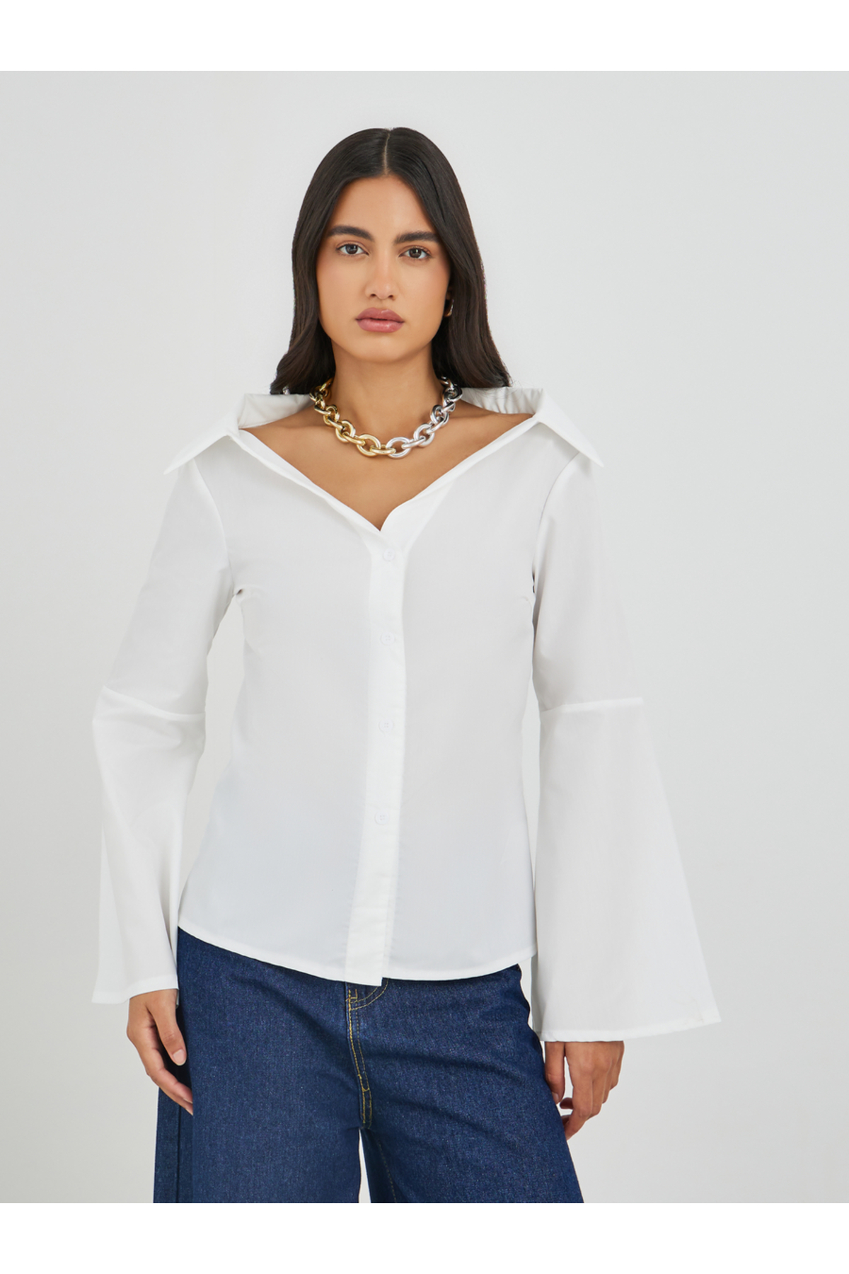 Styli Off Shoulder Button Down Shirt features
