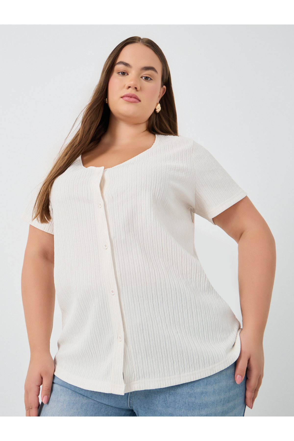 Styli Plus White Textured Blouse with Front Button features