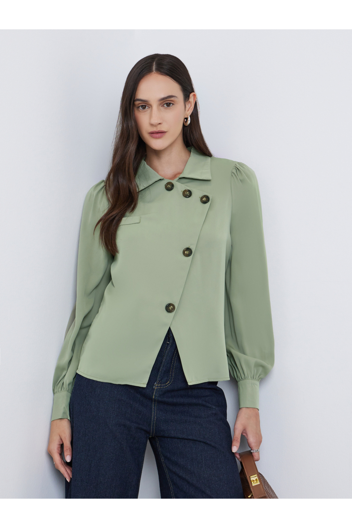 Styli Solid Front Button Balloon Sleeve Blouse features