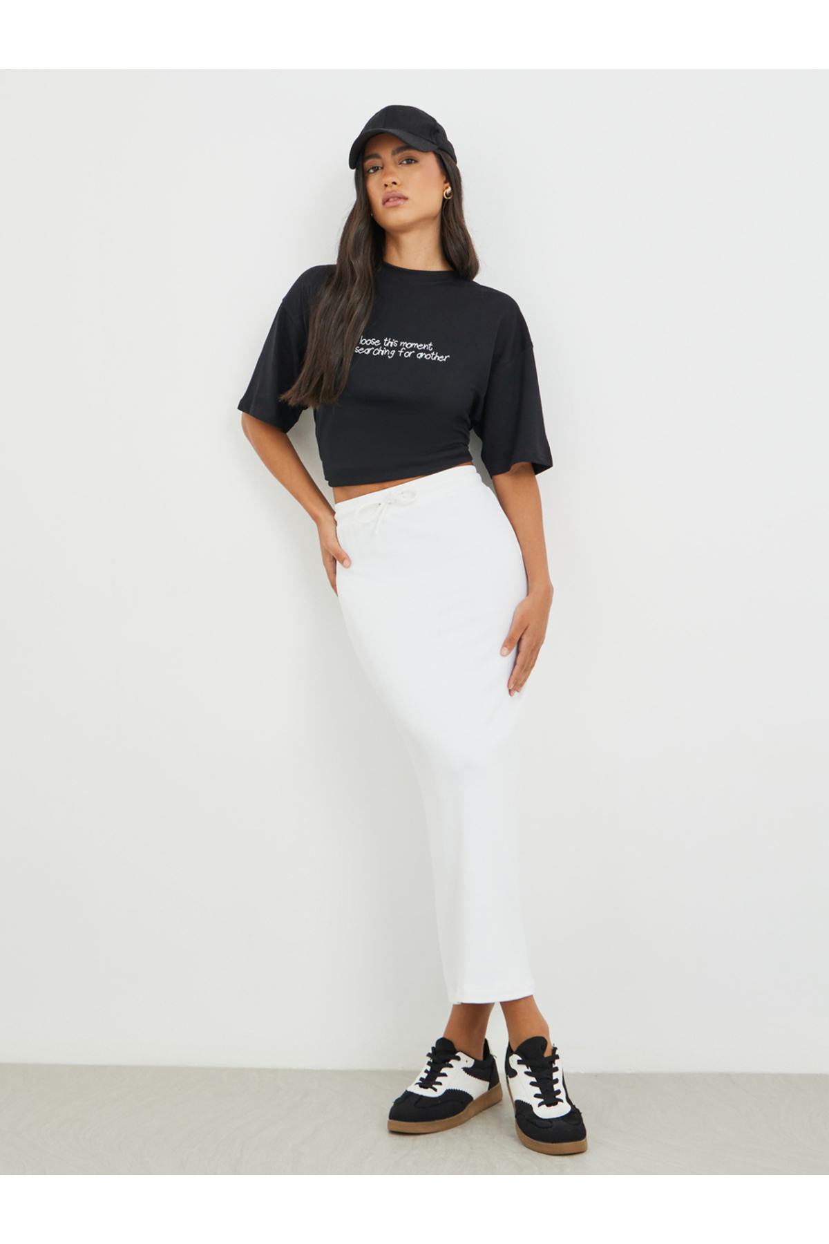 Styli Solid Knitted Terry Shift Midi Skirt features