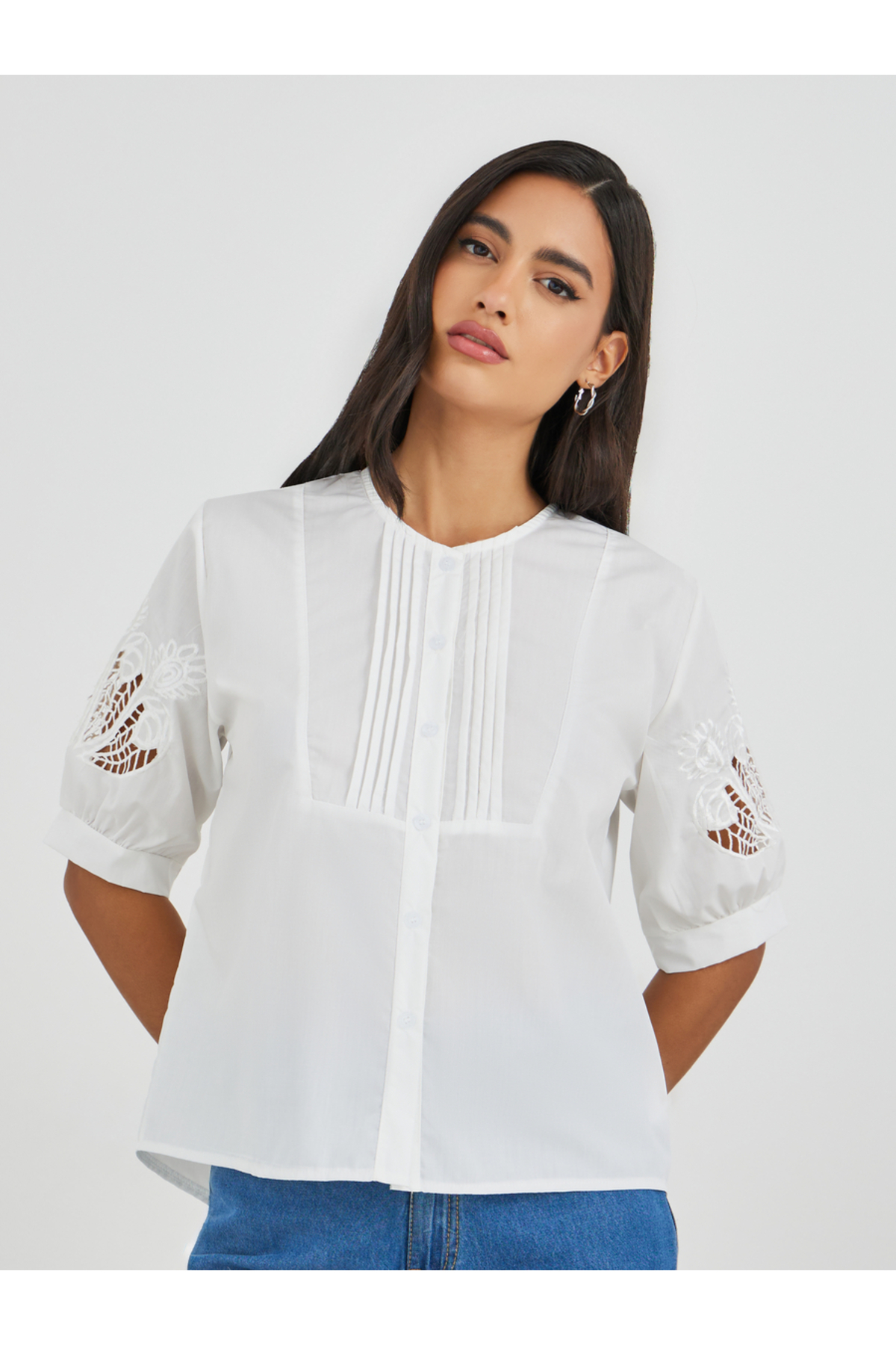 Styli Solid Round Neck Buttoned Top features