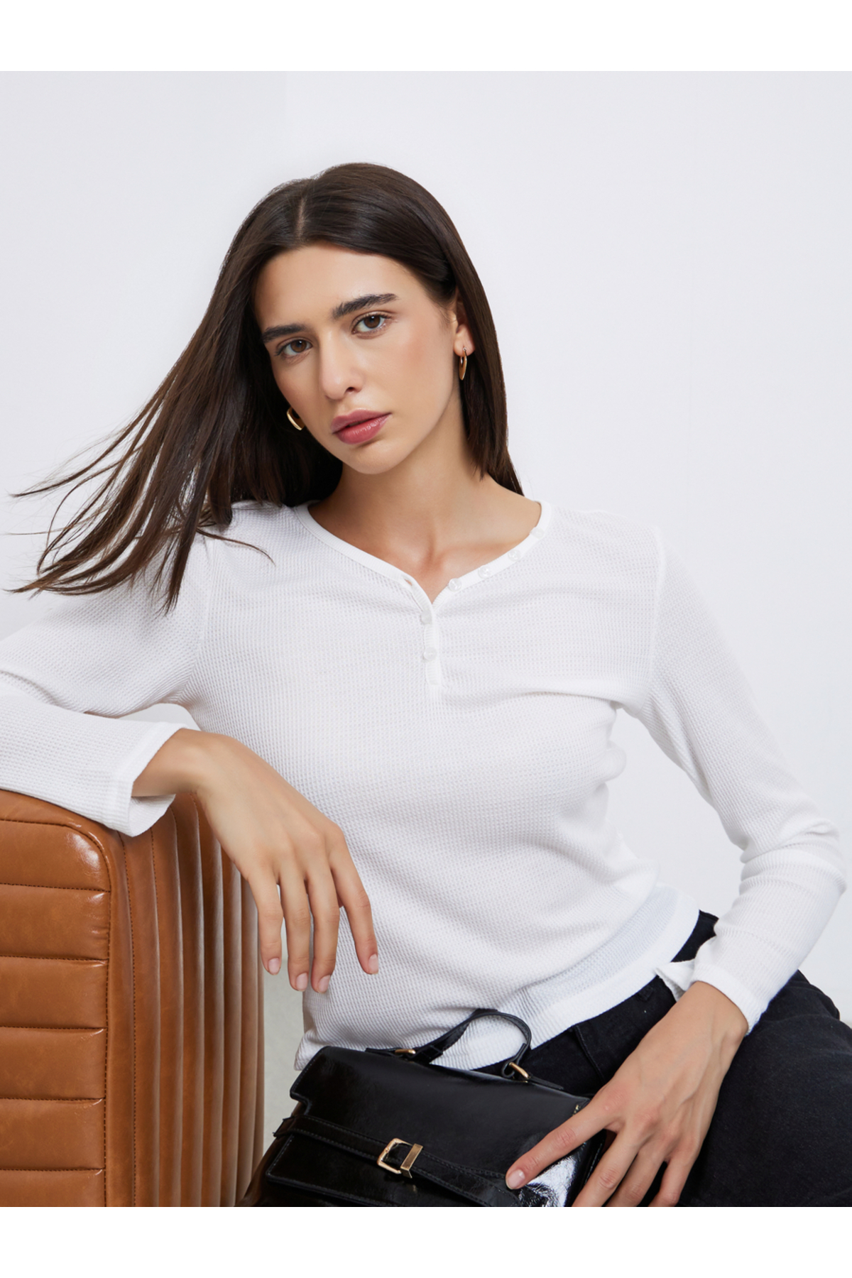 Styli White Solid Half-Placket Waffle Knit Top features