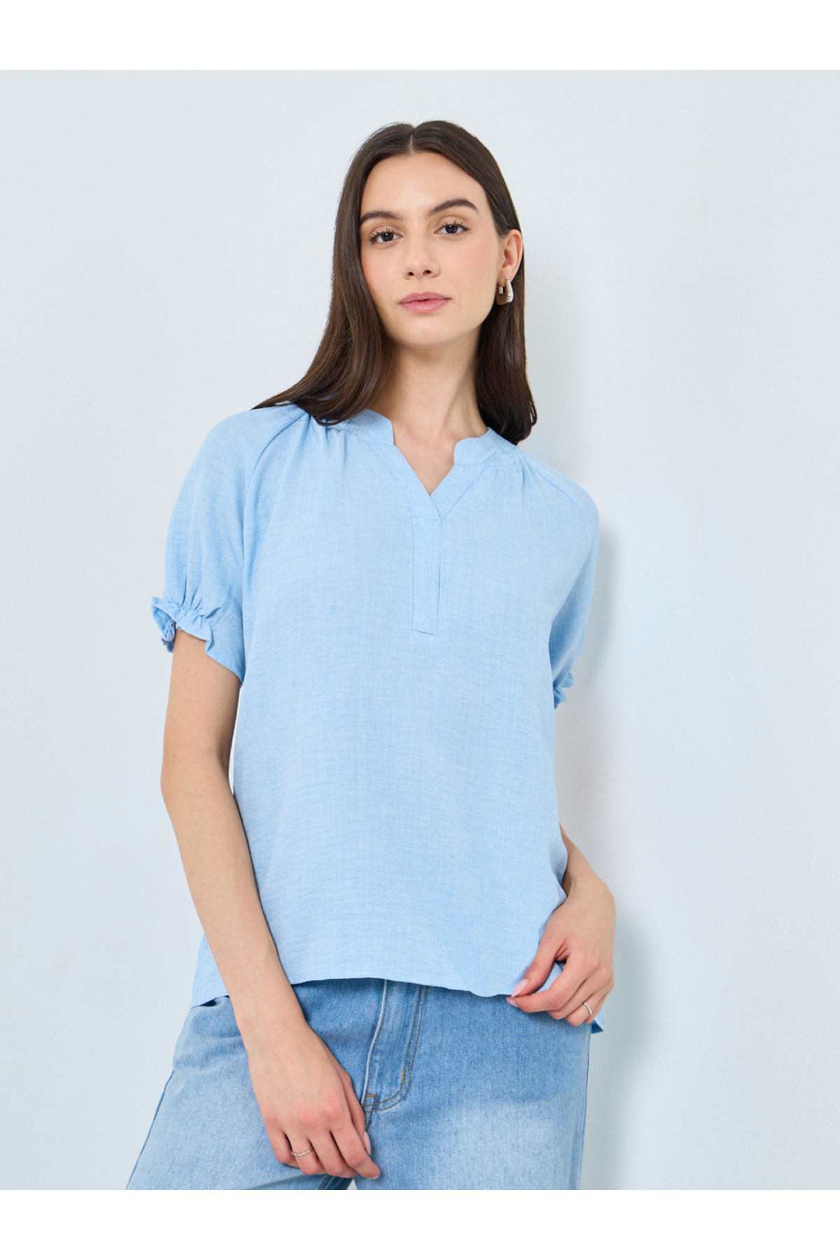 Take Two By Styli Solid V-Neck Puff Sleeve Blouse features