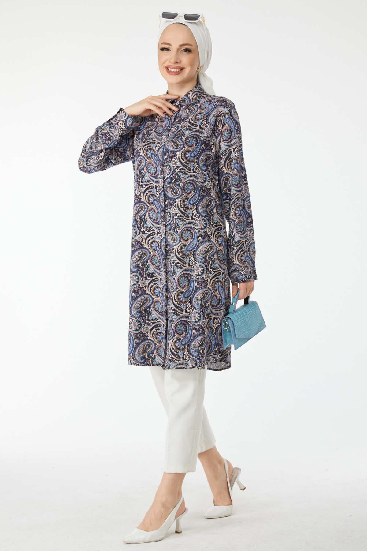 TOFİSA 24504-SAKS Patterned Tunic features
