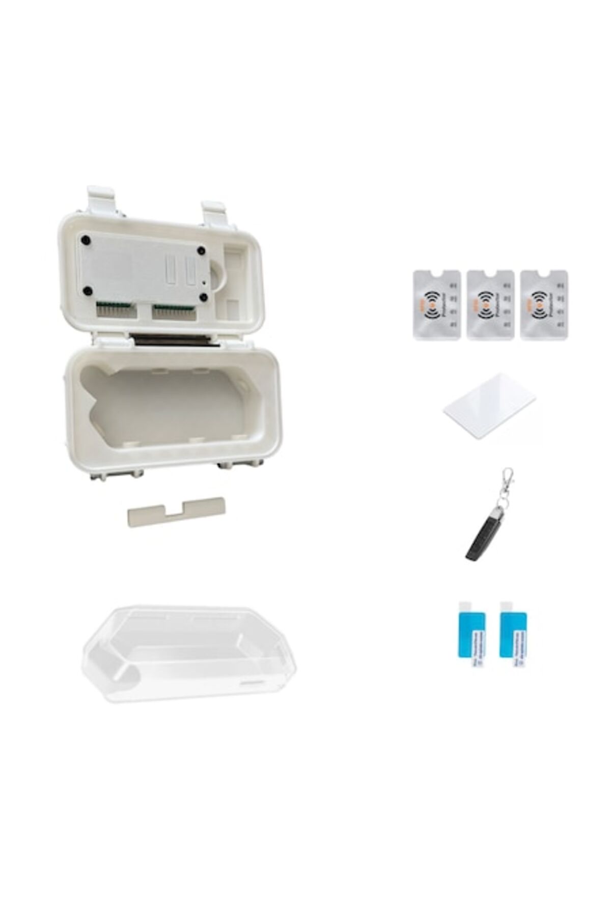Transparent silicone case, transport box case V12, white Wi-Fi board case, 2 display protection films, programmable remote control 433MHz, rewritable RFID card 13.56MHz, and 3 RFID protectors