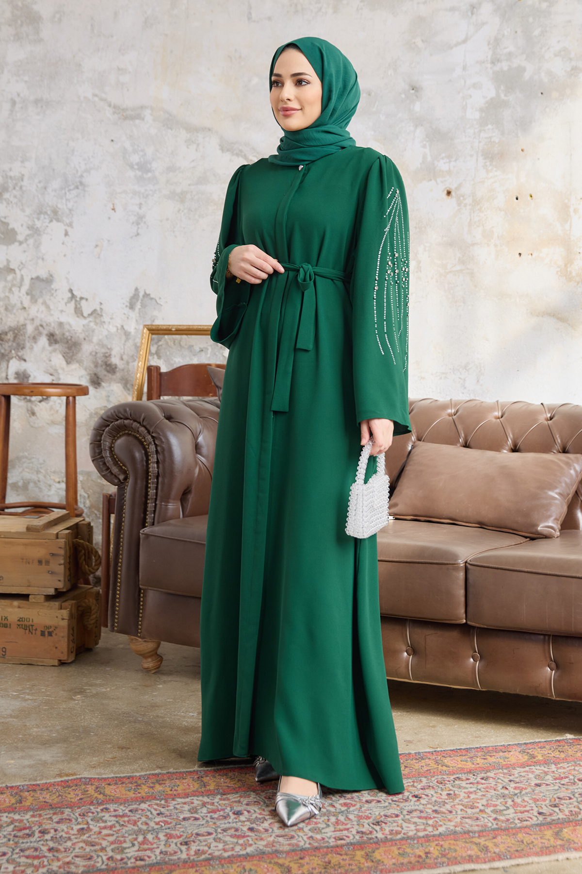 VAVİNOR Rona Sleeves Patterned Abaya - Emerald features