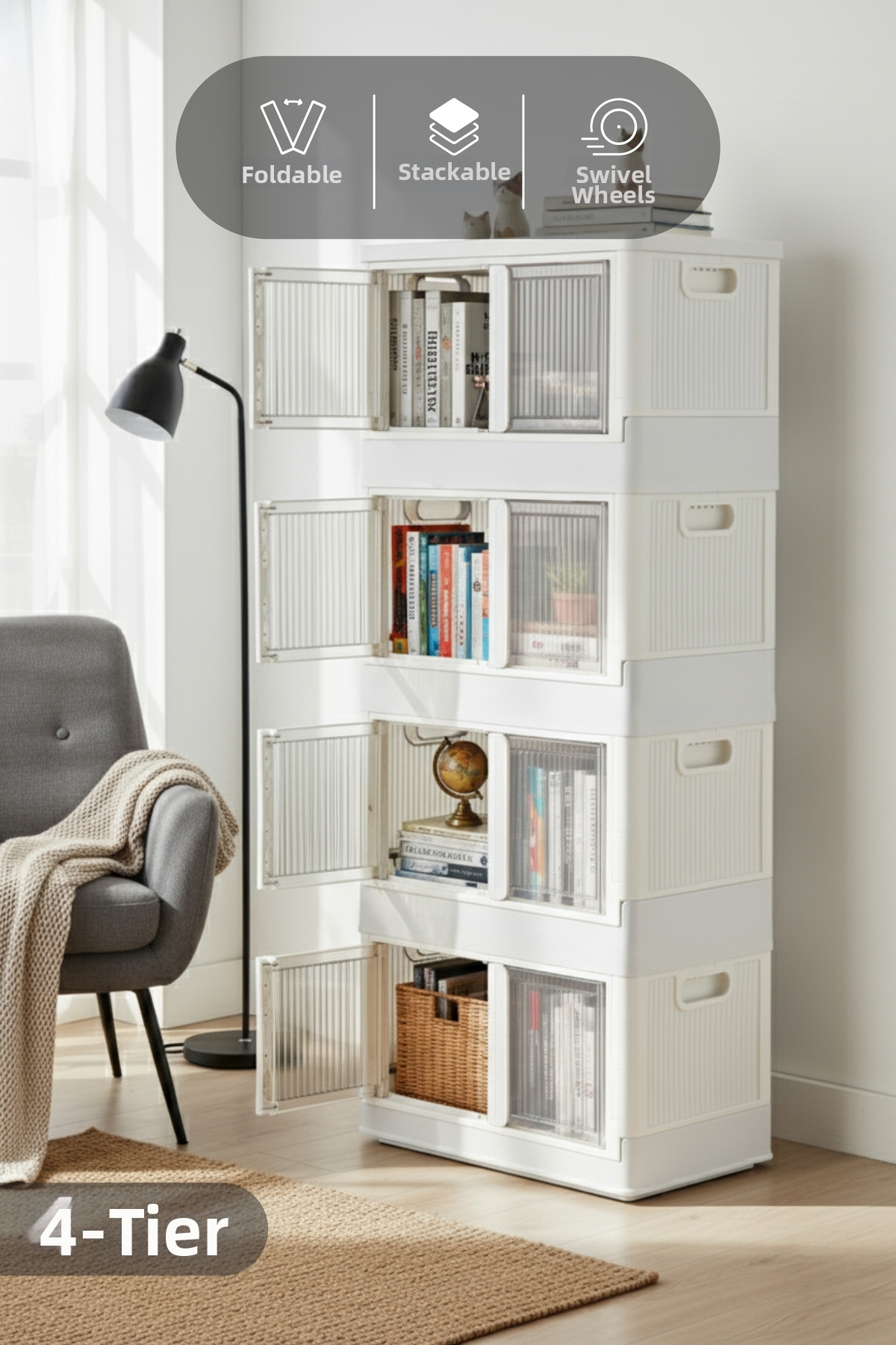 Vienev 4-Pack Stackable Folding Double Lid Organizer Box White features
