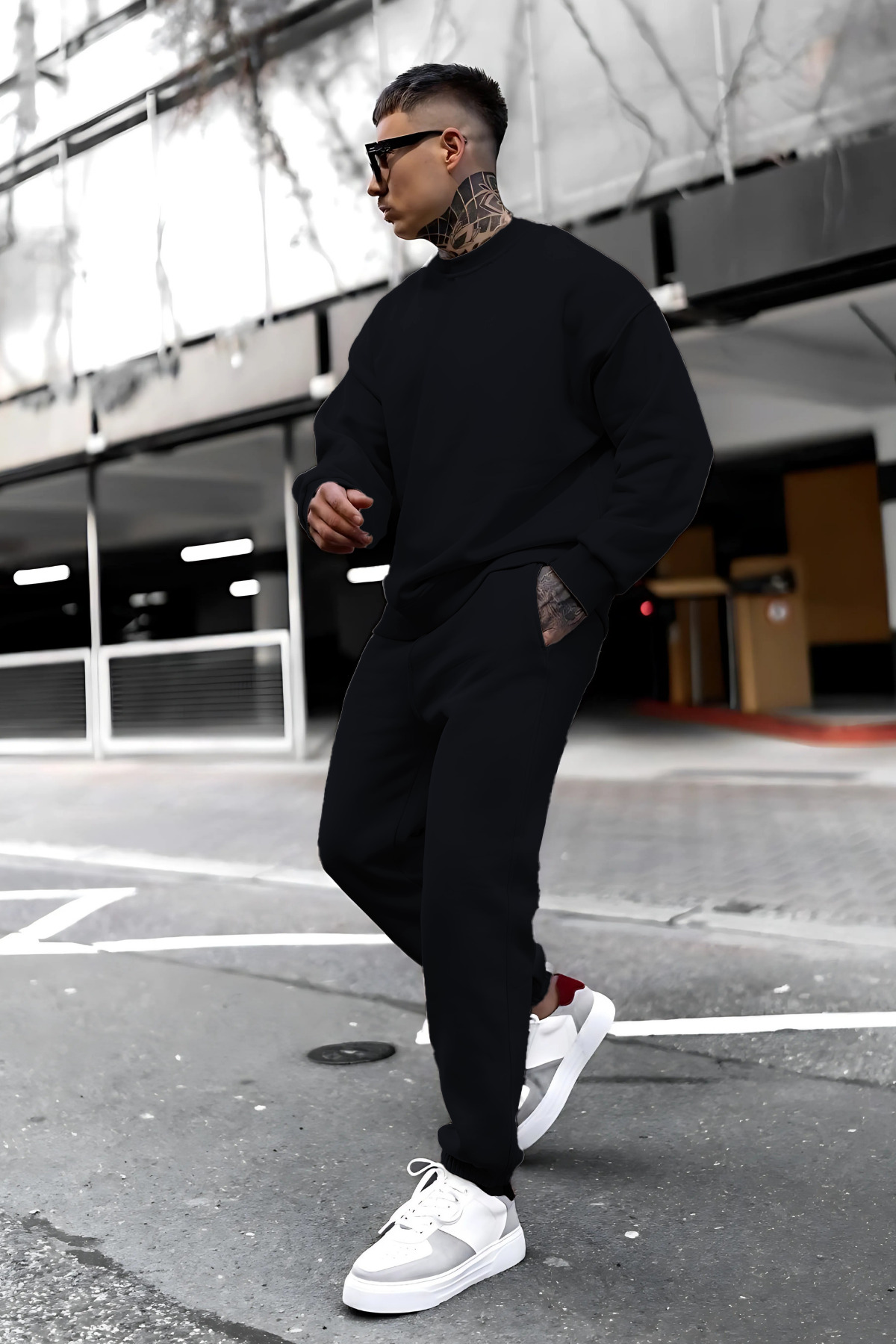 YAKAMEL Men's Oversize 3 Thread Basic Unprinted Straight Tracksuit Set