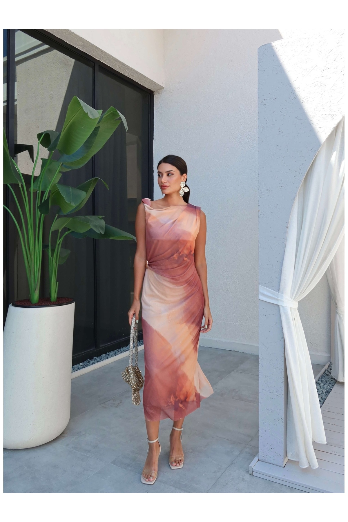 ESRAHELVACI Kahve Batik Desen Midi Elbise Özellikleri