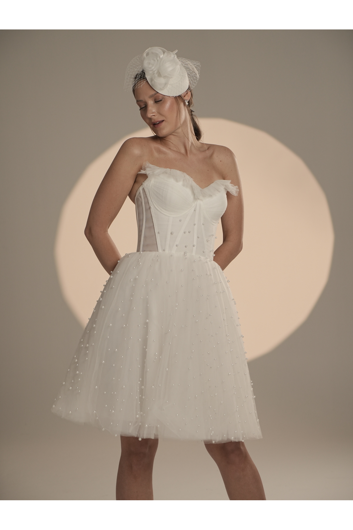 EVET couture İNCİ DETAYLI STRAPLEZ AFTER PARTİ ELBİSESİ