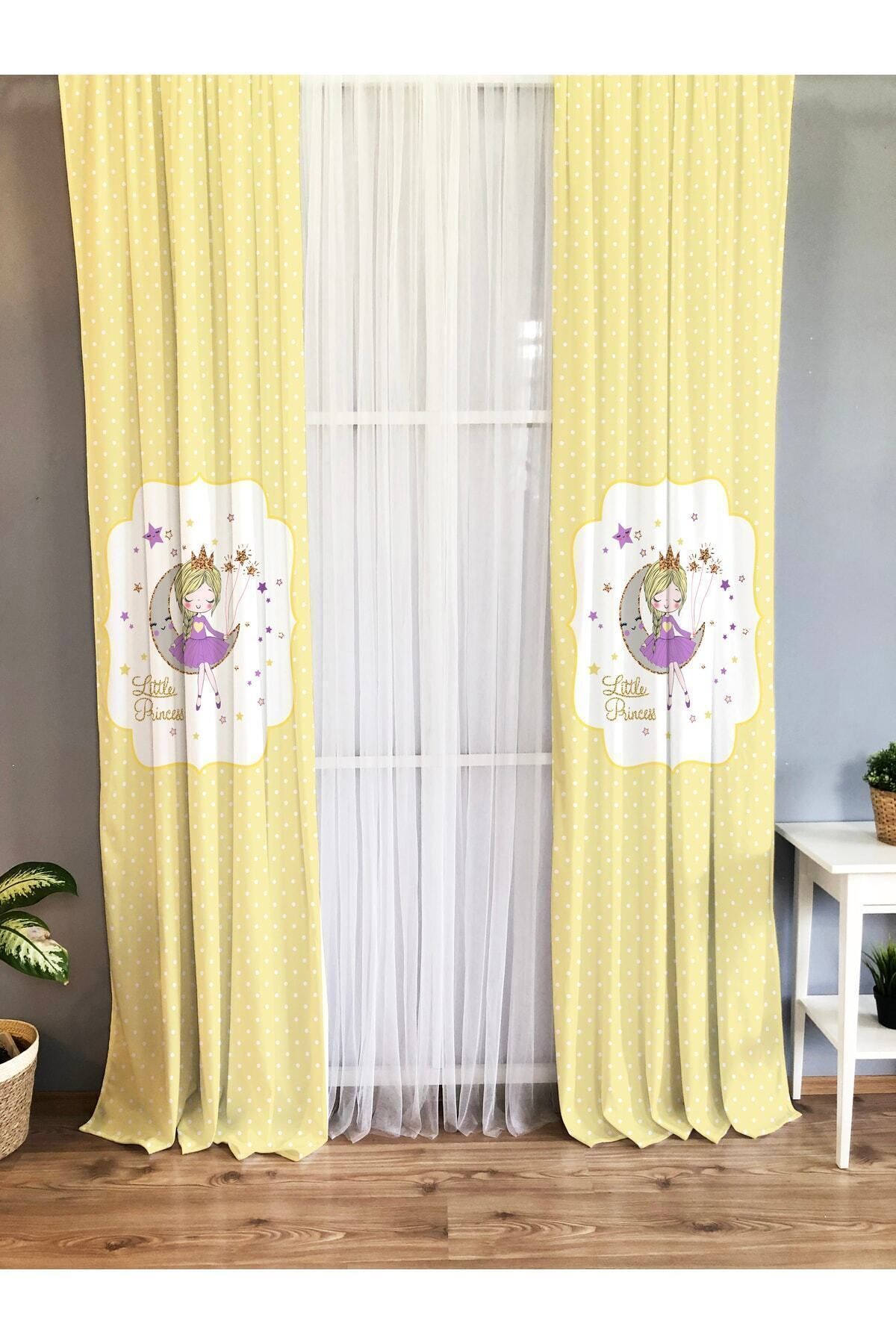 Evmila Baskılı Ay Kız Desenli Tek Kanat Kadife Doku Fon Perde - Sarı