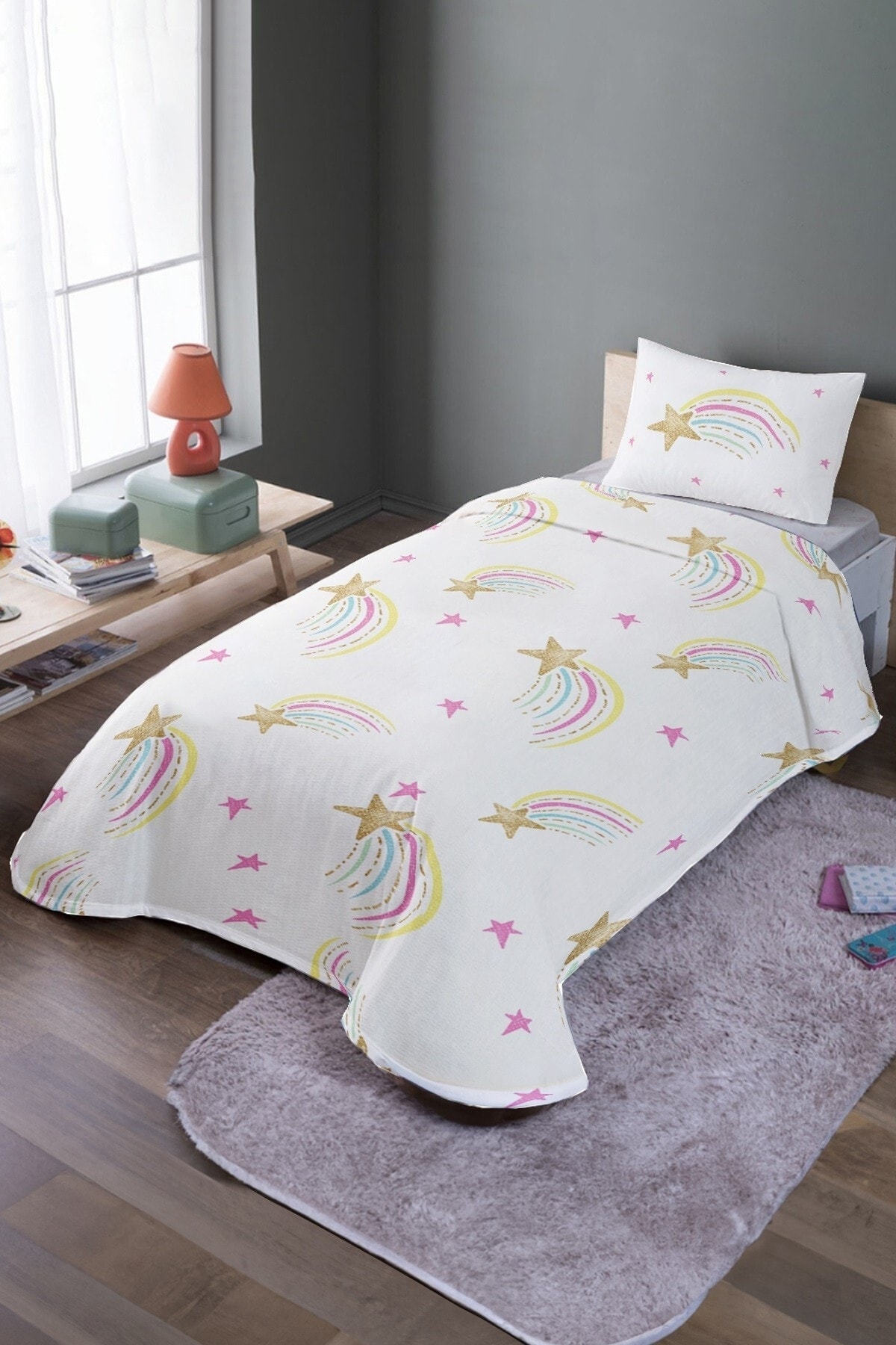 Evpanya Kayan Altın Yıldızlar Desenli Tek Kişilik Pike Takımı Ve Yatak Örtüsü