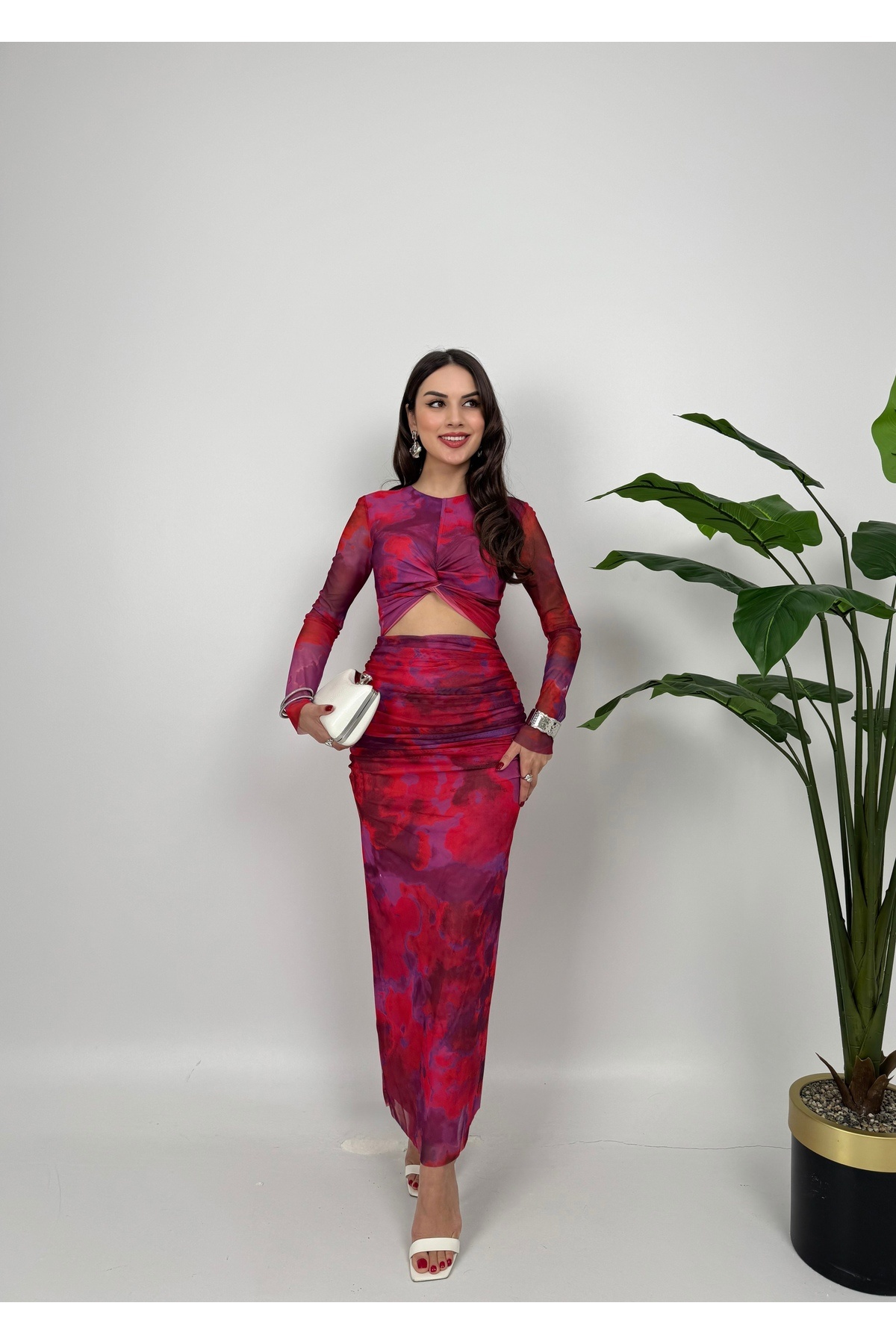Fade tül kumaş baskılı elbise