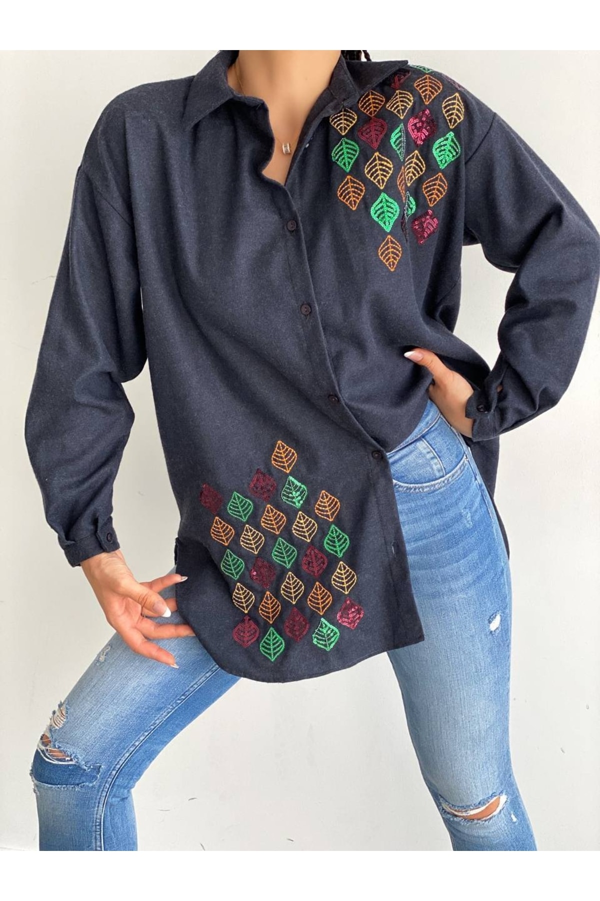 FancyWorld Örme Kaşe Kumaş Pul Payet Işlemeli Renkli Yaprak Desenli Antrasit Gömlek