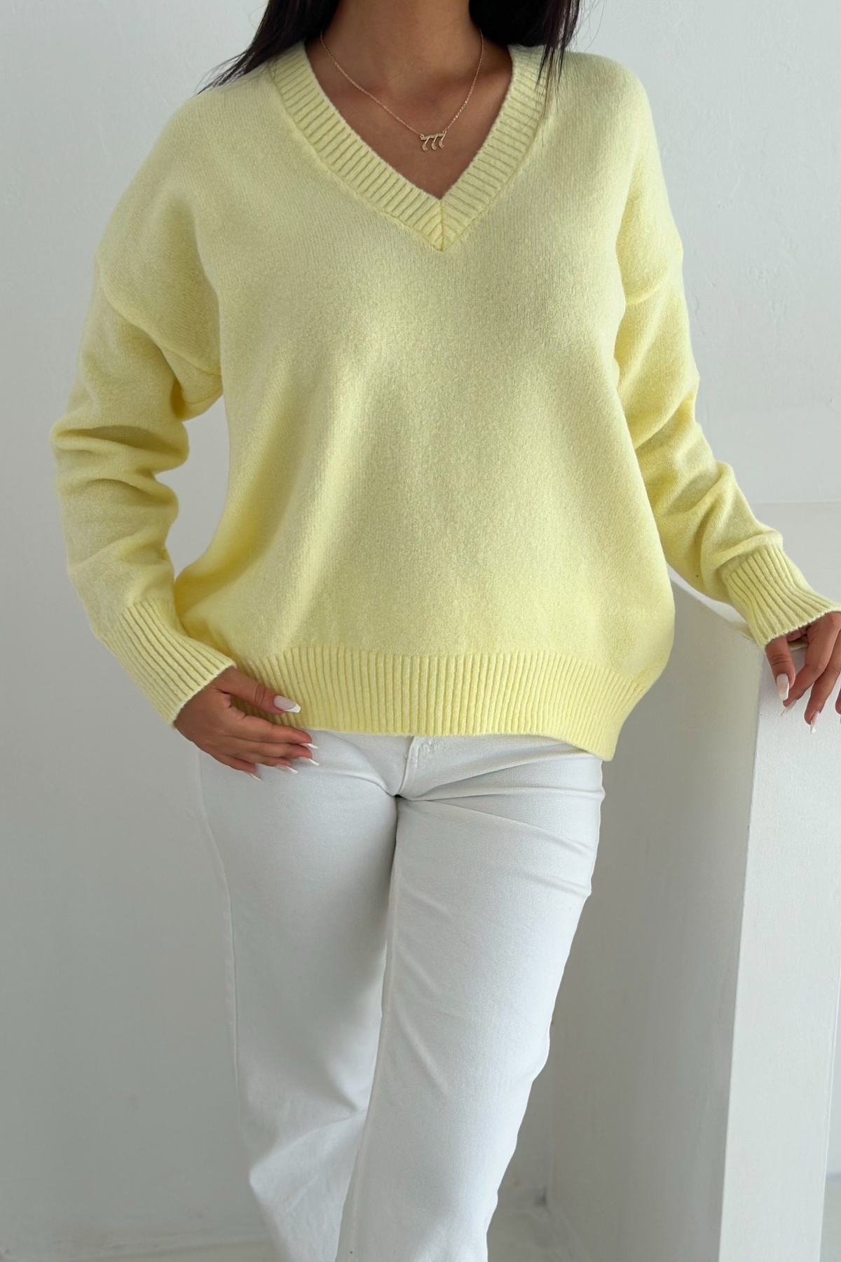 FEMELLE Sarı V Yaka Triko Kazak - Oversize - Standart Beden Basic Triko Kazak