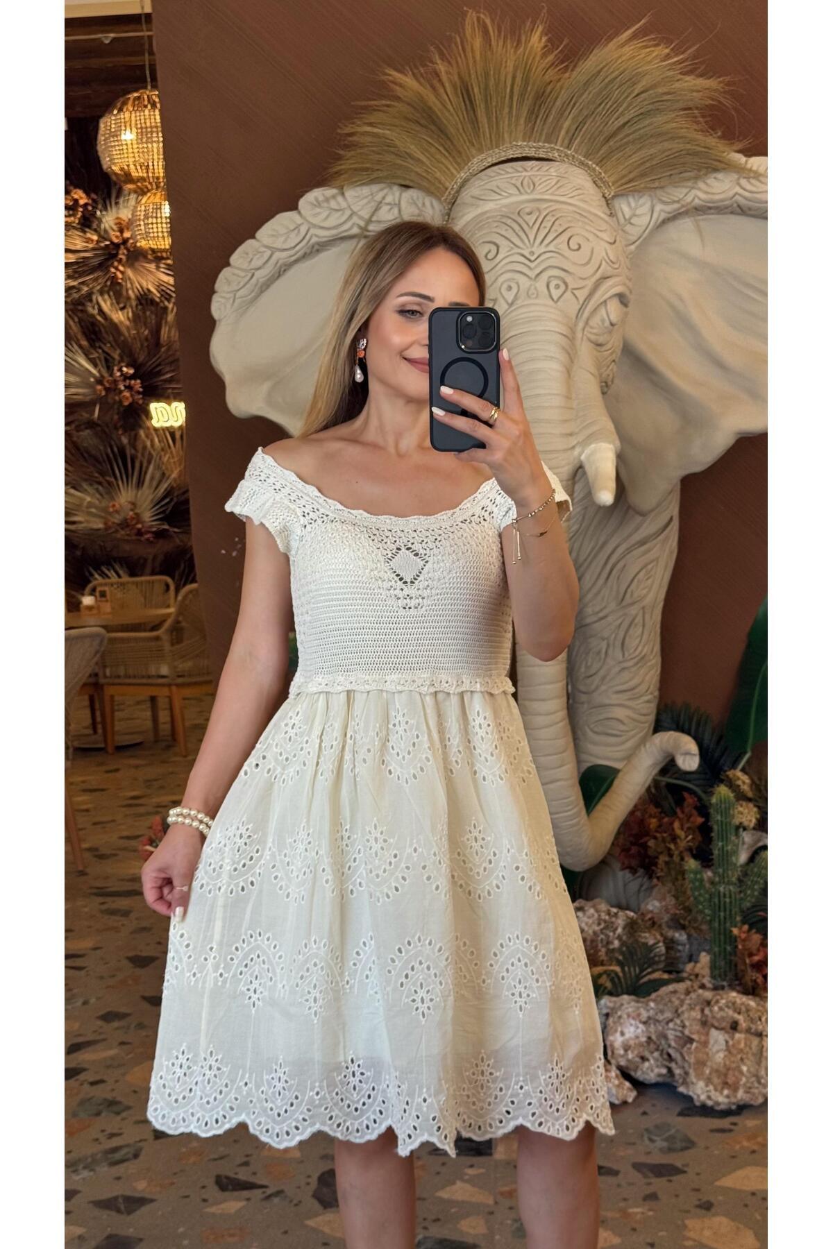 FEMİAS BRODE GARNİLİ TRİKO ELBİSE HAM EKRU