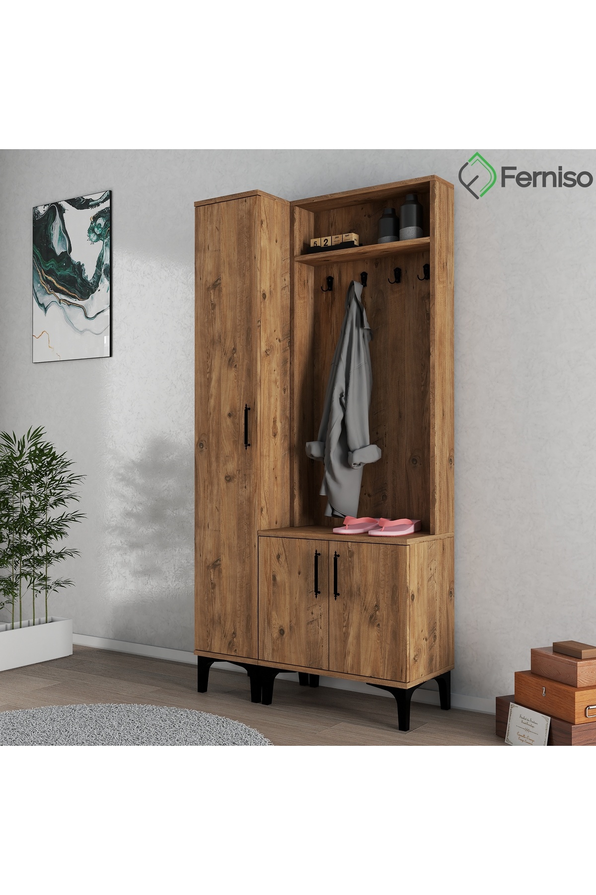 FERNISO Tek Kapaklı Ceviz Portmanto Vestiyer ve Ayakkabılık Dolabı