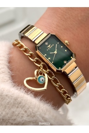 FERRO Altın/Metalik Çelik Bilezik Yeşil Kadran Taşlı Kadın Kol Saati, Su Yolu Bileklik Hediyeli