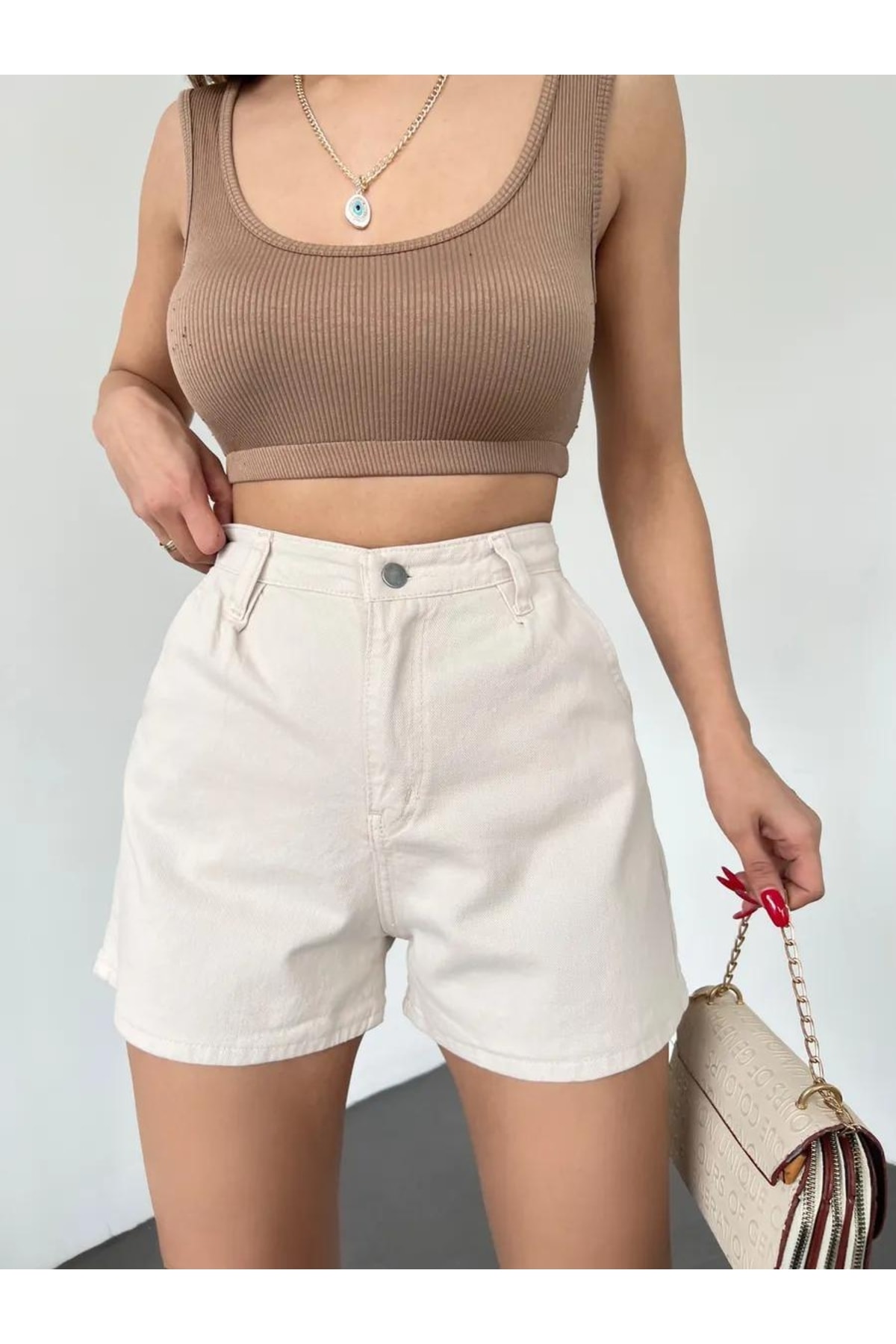 Fiti Giyim Yüksek Bel Geniş Paça Pileli Cepli Kot Şort Bej