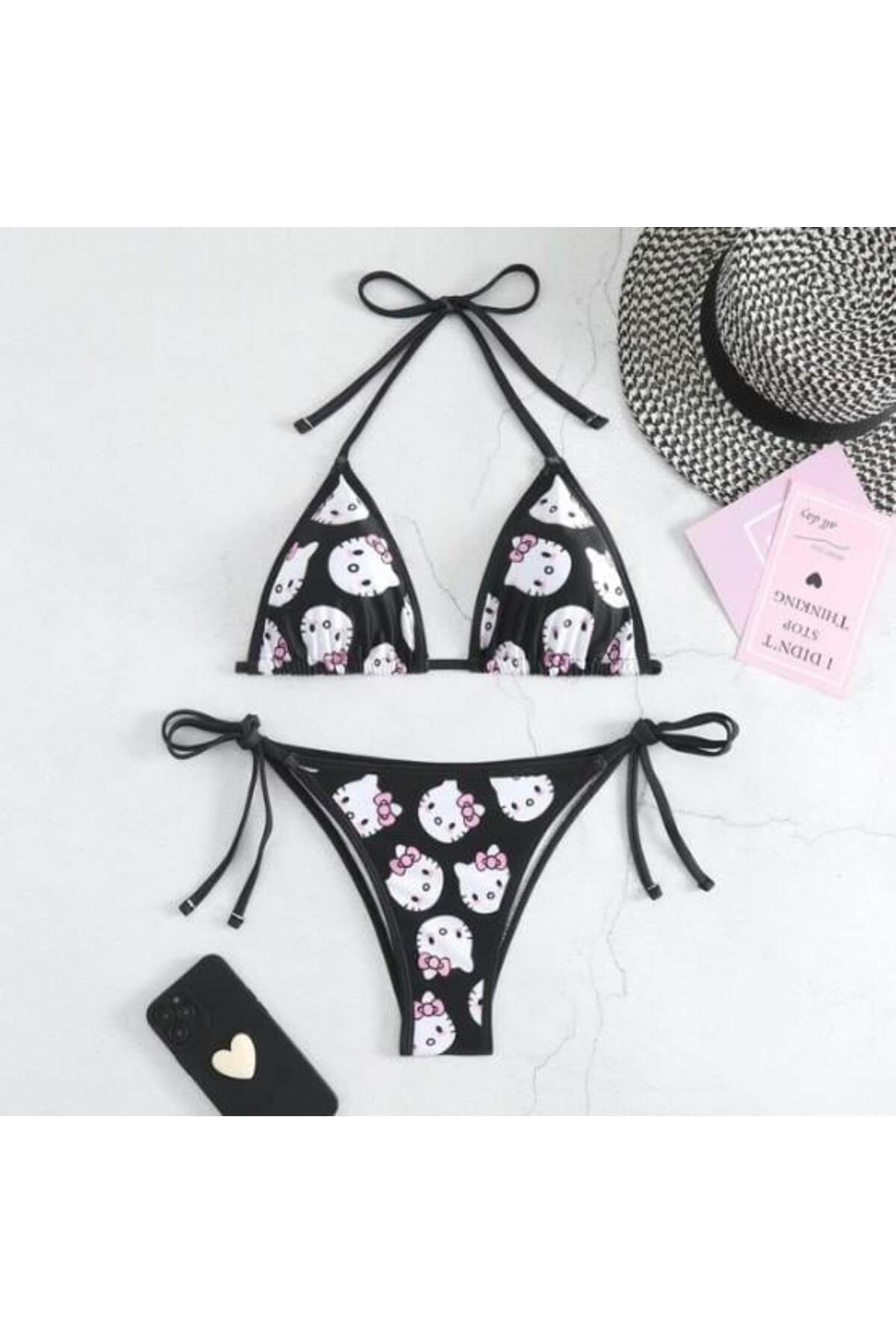 Genel Markalar Siyah Hello Kity Desenli Y2K Bikini Takımı