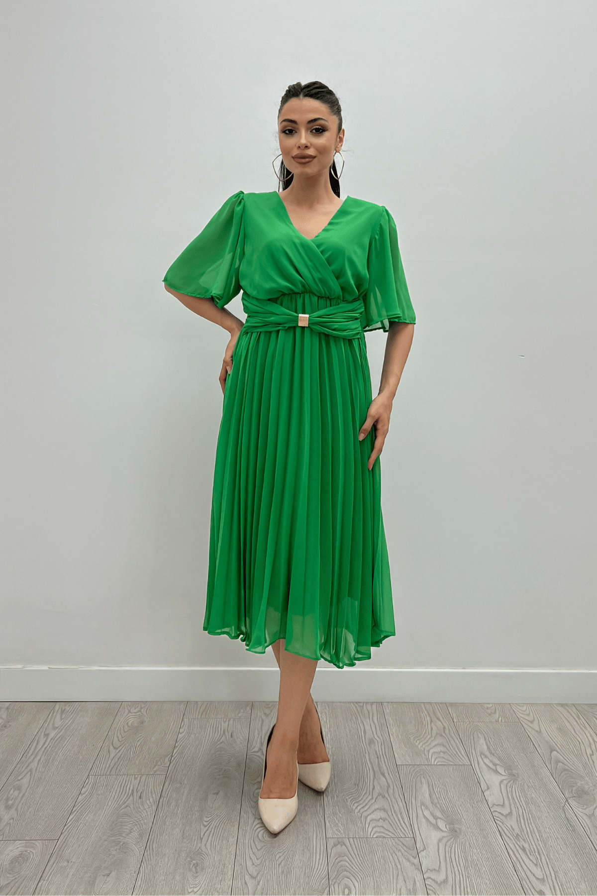 giyimmasalı Şifon Kumaş Kruvaze Yaka Pliseli Midi Elbise - YEŞİL