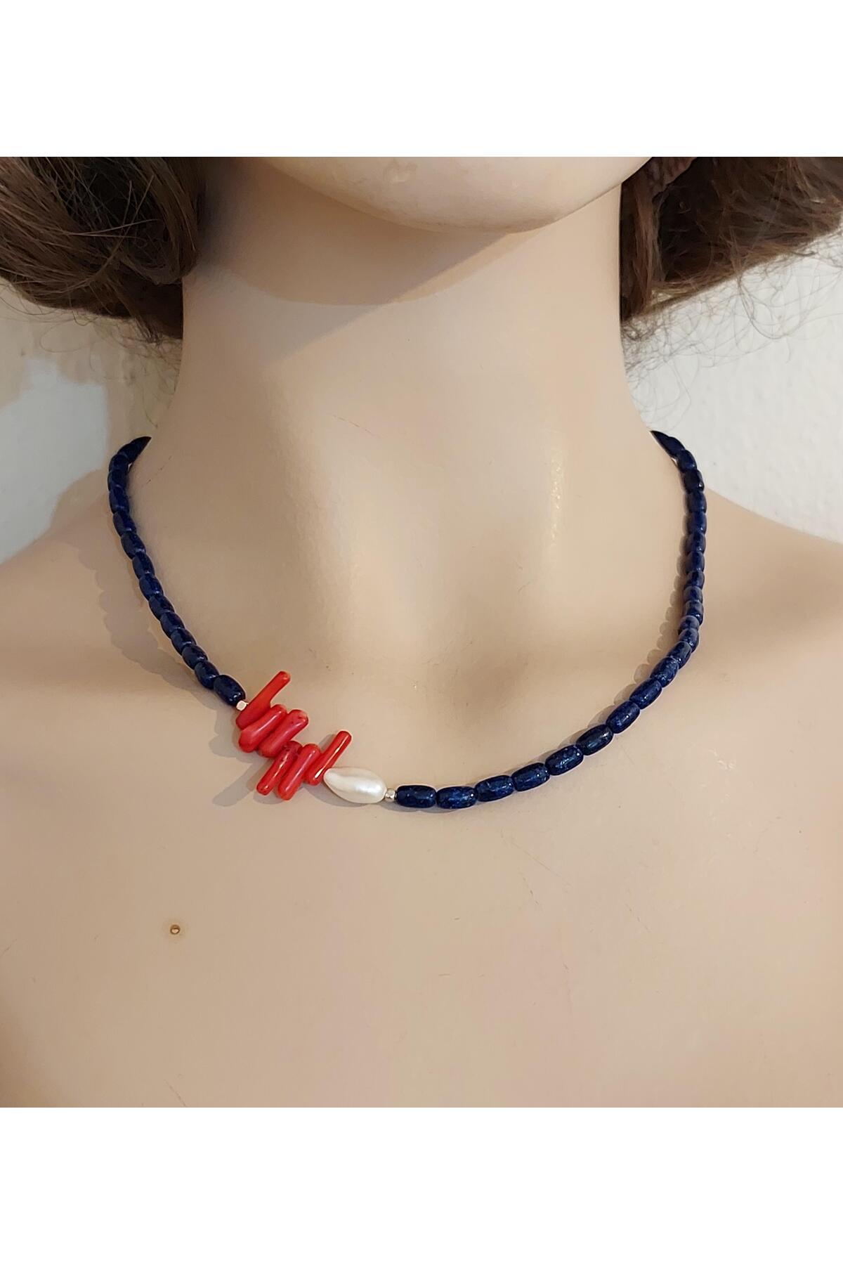 GİYUCHU LAPİS LAZULİ - MERCAN - İNCİ DETAYLI TASARIM KOLYE (Arpa Kesim)