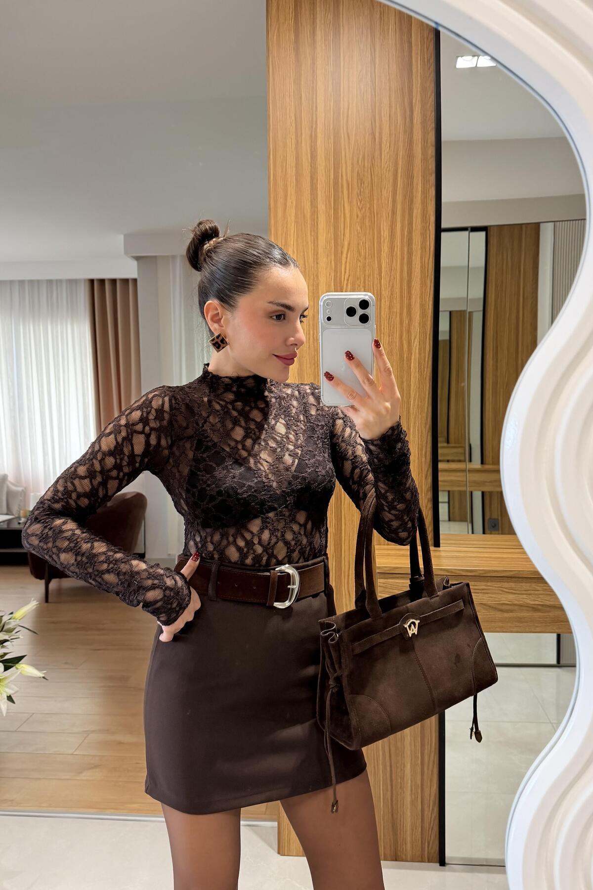 Gizem Ecemiş Sovie Kahve Dantel Bluz